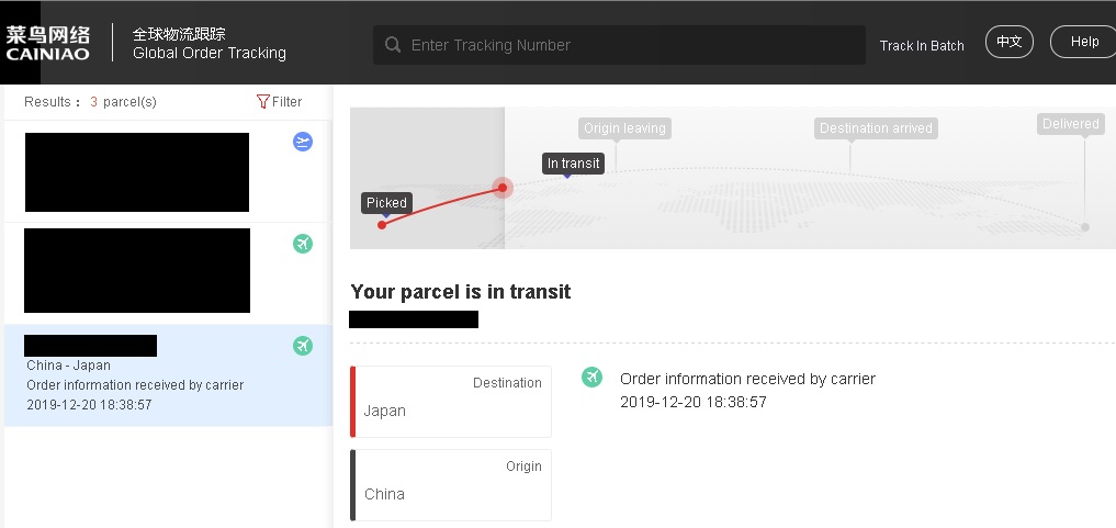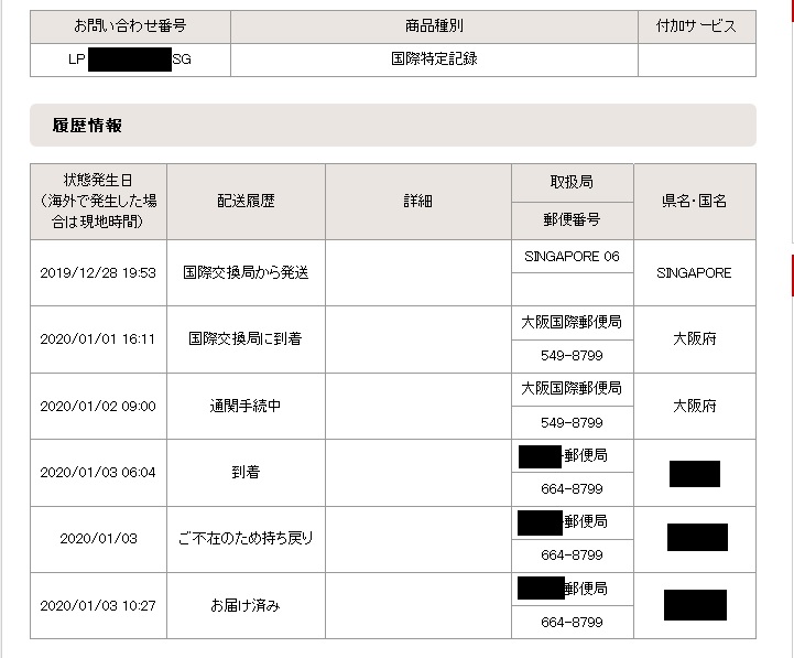 2019/12/20に発送されてから、2020/01/03の到着まで丁度2週間(14日)でした。