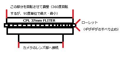 one's way > カメラアクセサリー > CPLフィルターを中華アクションカメラで試す CPLフィルターを中華アクションカメラで試す カメラアクセサリー 2017年08月05日 最終更新:2017/12/14 こんばんは。 久しぶりにアクセサリ系の話題です。 今回は、中華アクションカメラでCPLフィルターの効果を試してみました。 CPLフィルターとは円偏光フィルタの事で、反射光をカットするフィルタです。 釣りや運転時のサングラス等にも利用されおり、光の反射で見えにくくなっているものを見やすくしたり、青空や雲をはっきりと映す効果もあるそうです。 サングラスの偏光膜部分は固定ですが、この製品はレンズ部分を回転して効果を調整出来るという事で、実際に試してみた話です。 0.目次 1.解説 2.評価 3.総評 1.解説 今回もamazonで購入しました。 正式製品名は、「【ノーブランド 品】37mm CPL 偏光レンズ フィルター Gopro Hero3+ / Hero3 用 」で、中国からの郵便で到着期間は約2週間でしたが・・・今回は罠がありました。 実は、送付先情報が郵便番号と電話番号しか記載しておらず、郵便局から留守電が入っていました。 ただ、仕事の関係で折り返しが出来なくて、あやうく宛先不明で返送されるところでした。 (カンベンして欲しいです。。) というわけでまずは製品チェックです。 梱包を開封すると、箱の中にはレンズだけでした。。 (説明書等はありません) 製品(上3つが今回の製品)はレンズカバー、フィルター部、マウント部と分かれ、マウント部は別の37mm径のフィルターも装着可能の模様です。 ※下の2つは以前に購入したフィルタで、それぞれの記事にジャンプします。 ・ノーブランドUVレンズフィルター ・NEEWER カメラプロテクティブレンズ 元の通り組み立てて、サイズの確認です。 サイズ(外形):39mm※最大 厚さ:15mm ちょっと分厚いですよね。 厚みがあるとケラレが発生するので薄いほうが良いのですが・・。 サイズ(内径):23mm テストで使用した中華アクションカメラ(Apeman A80)のレンズ部(21mm)では加工(詰め物)をしないと落ちてしまいます。 使い方が全く不明でしたので、何か情報が無いかを検索したところ、アクションカメラではありませんが、普通のカメラの方での使用方法がありました。 その際に参考にさせて頂いたサイトです。 ・デジタルカメラ レンズフィルター 初級講座 ・デジカメ入門☆使い方・使いこなし&撮影テクニック教室 厳密にはCPLとPLでは違いがあるみたいなのですが、フォーカス調整出来ない広角なアクションカメラではCPLを選んでおけばよいみたいです。 使用方法は、ローレットと呼ばれるすべり止めの部分を抑えながら、その前の偏光膜部分を回して、効果具合を調整します。(フィルター部は360度回転) 尚、効果の効きは90度単位だそうです。 (180度で最小ー最大ー最小となる) 2.評価 では、実際アクションカメラ(Apeman A80)に装着して撮影してみた結果です。 撮影時の環境(設定)は次の通りです。 ○撮影時の環境(設定) 解像度 :1080p(60fps) WDR :OFF W/B :オート 天候 :晴れ時々曇り 装着後、撮影中に偏光膜部分を回転させ、効果の確認がわかりそうな部分のスクリーンショットを取得しました。 尚、厚みがあるので装着するとケラレが発生しています。 ●順光(太陽がやや後方での撮影) ○効果最小 反射して水中等が見えにくいと思います。 ○効果最大 水中が多少見えていると思います。 ●逆光(太陽が左前面での撮影) ○効果最小 水中も少し見えますが、暗い感じです。 ○効果最大 水中もはっきりと見えています。 尚、効果を最大に発揮するには、被写体と太陽の位置(順光、逆光)や角度(太陽に対して90度?)や設定(露出設定)等も考慮する必要があるようで中々扱いが難しい製品です。 どうやら、真順光や真逆行でも効果が無い様です。 更に液晶が小さいアクションカメラでは、効果の確認がし辛くコツを掴むまでには時間が掛かりそうです。(なれると2インチの画面でもなんとなく判るようになりますが・・・) 又、今回掲載しておりませんが、空や雲もはっきりと出来るみたいなのですが、上で上げた太陽の位置や角度、設定不足か旨くいきませんでした。 他の注意点としては、フィルターを装着すると暗くなるのでシャッタースピードが低下します。 その結果、60fpsで撮影しているのに30fpsに落ちている等もありえますのでご注意を。 今回は時間の関係で断念しましたが、このあたりは今後使っていってうまく行ったら情報を追加したいと思います。 3.総評 ○良い点 ・安いのでお手軽に試せて、水面の反射には効果が確認出来る。 ○悪い点 ・大きくて、重いので固定での使用が中心になる ・説明書等が一切なく、使用方法を自分で調べないと判らなかった。 (CPLフィルタの効果や順光、逆光や角度も含めて) ・使用する機種によってはケラレが発生する。(Apeman A80でケラレを確認) ・偏光膜部分の枠に効果の確認出来る90度毎に線等があれば良かった。 ・発送時住所・氏名の記載が無かった(郵便番号と電話番号のみ