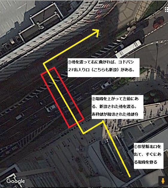 one's way > 雑記 > ヨドバシ梅田ダンジョンに橋が掛かった話 ヨドバシ梅田ダンジョンに橋が掛かった話 雑記 2017年07月04日 こんばんは。 今回は、JR大阪駅とヨドバシ梅田との漸く橋が繋がった話です。 今年の3月末に、JR大阪駅の2F「アトリウム広場」から、1Fに降りる階段(仮設)が撤去された話はニュースでも話題となり、記憶に新しいと思います。 その後、JR大阪駅からヨドバシ梅田に行くには、2Fに登ったり地下に降りたりして面倒なルートを辿る必要がありました。 又、道路を挟んで目の前にあるのにぐるっと回って行かないといけなく、一見さんや観光客はほぼ迷う事から、梅田ダンジョンと呼ばれていました。 又、例えとしてドラクエ1の最初の城と魔王の城のように見えているけど、ぐるっと回らないとたどり着けない的確な表現も話題になりました。 ○ヨドバシ梅田へのルート ※緑枠の部分が、撤去された階段があったところ。 黒色が地上ルート(一部2Fへの上り下り有り) 灰色が地下ルート 赤が今回新設されたルート(水色が橋) それが06/30(金)に漸く開通し、ようやくダンジョンでの迷子も減るだろうと話題になっています。 というわけで、今回のお話は、ヨドバシに出来た橋の話です。 ネット上ではこの橋を「ヨドバシ橋」や「ヨド橋」・「バシ橋」等と色々呼ばれているみたいです。 流石に開通日は仕事でしたので見にいけませんでしたが、07/02(日)に確認して来ました。 橋の位置は、大阪駅東側の御堂筋北口を出て、2Fに上がる階段を上ったところです。 上って左側に橋が出来ています。 (本当は、写真をと思ったのですが・・・人が一杯で諦めました) ○新設ルート詳細 橋が出来たと行っても、本当に掛かっただけで、雨避け等はまだ設置されていませんでした。 又、橋を渡って左側(グランフロント側)はまだ工事中で、こちらは9月末頃の開通予定だそうです。 但し、現在の状態では橋部分に屋根が出来ても、JR出口からヨドバシの橋までは、屋根が無いので雨の日は濡れる可能性があり、濡れたくない場合はやはり地下からのルートが良いようです。 ちなみに、出入り口が新設された2Fフロアーですが、カメラ等を販売しているフロアで、出入り口直ぐ右手側にGoProや国内メーカ等のアクションカメラ及びアクセサリー類が置かれています。(以前より、GoPro系アクセサリパーツの現物を見たい場合に覗いてました) 一応、本家以外のモドキのアクセサリも一部あるので、現物を見たい方は店内を覗いて見るのも良いと思います。(お値段は国内通販系と大体同じから、それ以上等ピンキリでした。) とりあえず仮設橋が撤去されて、どのルートも混み込みだったので少しでも分散されると良いなと思っています。 以上 タグもどき:ヨドバシ パーツ 梅田 ダンジョン PR