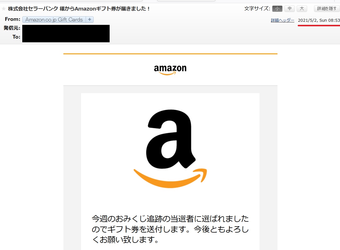 one's way > 雑記 > 【雑記】セラーバンクのおみくじ追跡に当選でAmazonギフト券を貰う(通算3回目) 【雑記】セラーバンクのおみくじ追跡に当選でAmazonギフト券を貰う(通算3回目) 雑記 2021年05月02日 最終更新日:2021/05/02 コロナ自粛で外出を控えている折角のG/W2日目ですが、そんな中に届いた嬉しい当選メール。 当選したのは「セラーバンクのおみくじ追跡」でした(通算3回目)。 〇当選メールの画面(一部) 応募した過去からの総数(追跡番号の数)は覚えてないですが、2019年に存在を知ってから当選した履歴は 2019/12に1回・2020/12に1回、そして今回(2021/05)となります。 (今思えば履歴を取っておけばブログのネタになるのにと一寸後悔・・) 前回(2020/12)当選時以降も通販の利用が減っており、数少ない追跡番号の中で当選しました。 (厳密には海外通販(Aliexpress)やAmazonで小物は幾つか購入しているのですが、日本国内での追跡番号が付かない物や、デリバリープロバイダーでの配送が多いので応募は出来ず・・) ちなみに今回当選した時に運んでもらっていた物はこちらです。 ・【ジャンク】Dell E2417H 23.8 インチワイドモニタを入手 このモニターの補修用部品も(海外通販で)発注は(追跡番号付きで)しているので、到着したらまたおみくじ追跡に応募する予定です(笑 と言う訳で次回も当たります様に・・ 〇参考 ※セラーバンクさん(おみくじ追跡)のサイト ・[外部サイト]【おみくじ追跡】日本郵便・ヤマト運輸・佐川急便などすべての追跡番号に対応(トリセド) 以上 〇更新履歴 ・2021/05/02 初版 タグもどき:セラーバンク おみくじ追跡 PR