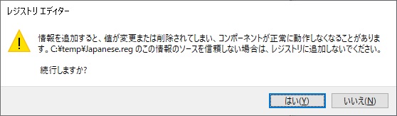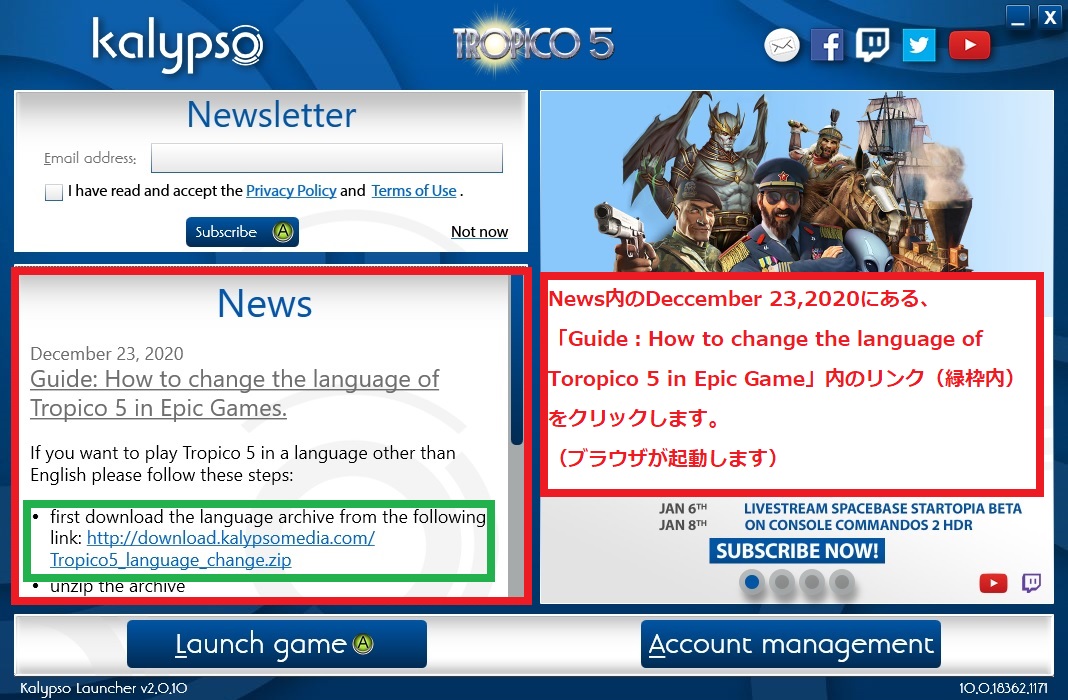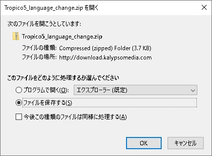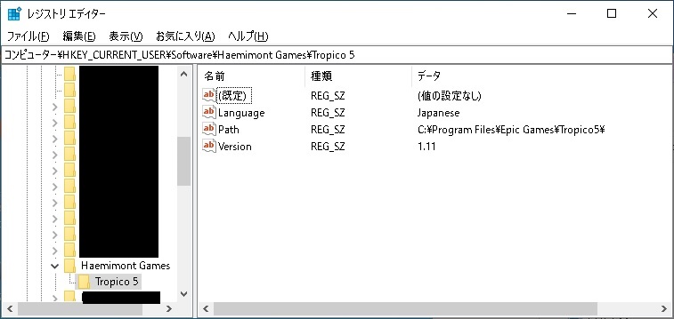 one's way > ゲーム > 【Epic】Epic版Tropico 5(トロピコ 5)の日本語化方法 【Epic】Epic版Tropico 5(トロピコ 5)の日本語化方法 ゲーム 2020年12月24日 最終更新日:2020/12/24 本日限定(2020/12/24)で無料配信されているEpic版Tropico 5(トロピコ 5)。 デフォルトの言語は英語なのですが、日本語の設定方法が少し判り難いので纏めた備忘録です。 尚、対象はEpic版専用で、他のエディションでは未確認です。 ※恐らくダメかと思います。 1.手順 ①Tropico 5を通常通りインストールする。 ②ゲームを起動させ、「kalypaso lancher」を表示させます。 ※まだゲーム自体は起動させません ③「kalypaso lancher」左の、News内の記事で「Deccember 23,2020」にある、 「Guide:How to change the language of Toropico 5 in Epic Game」内のリンク(緑枠内)をクリックします。 〇kalypaso lancher画面 ④ブラウザが起動し、ファイルの保存が始まりますのでファイルを保存します。 ※デフォルトファイル名は"Tropico5_language_change.zip" 〇ファイルの保存 ⑤保存したファイルを一時フォルダー(C:\temp等)に展開します。 ※解凍先は適当なフォルダーで可 ※当方は全てのファイルを解凍していますが、最低"Japanese.reg"だけでも可 〇展開時のファイル一覧 ⑥展開したファイルの中から、"Japanese.reg"を実行します。 尚、ユーザーアカウント制御(UAC)等の画面やレジストリエディター確認のメッセージが表示されますが"はい"を選択して下さい 〇レジストリエディターの警告画面 ⓻レジストリエディターのメッセージで、「キーと値がレジストリに正常に追加されました」と表示されれば完了です。 〇レジストリエディターの正常終了画面 ゲームを起動して、日本語表示になっている事を確認して下さい。 ※kalypaso lancherは英語のままです 〇日本語化完了後の画面 ゲームから設定出来る様にしてなかったのですね。 ちょっと笑ってしまいました。 前から一寸興味があったので楽しみです。 この後仕事の準備をしないといけないのでこれからプレイされる方への参考になれば幸いです・・。 2.解説 ダウンロードした"Japanese.reg"を実行すると、レジストリに以下の内容が書き込まれます。 ※ファイルを確認したらこれだけでした 〇場所 "HKEY_CURRENT_USER\software\Haemimont Games\Tropico 5" Key:"Language Type:”Reg_SZ” 値:"Japanese" 〇実行前の状態 〇実行後の状態 以上 〇更新履歴 2020/12/24 初版 タグもどき:Epic Tropico 5 PR
