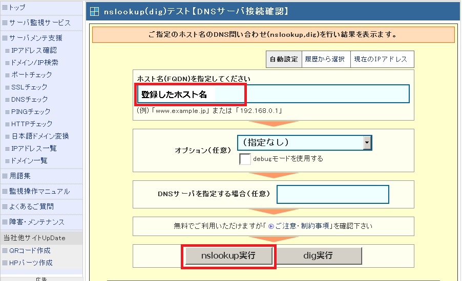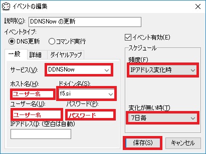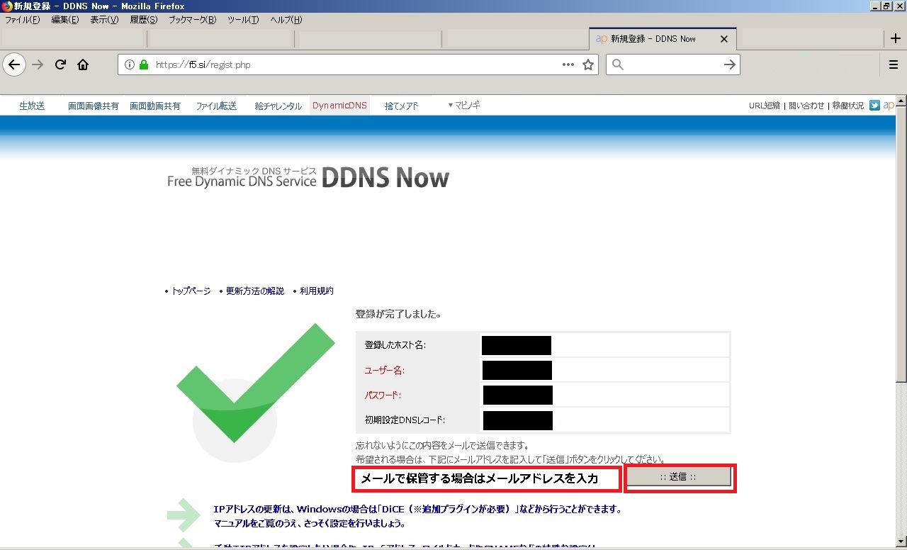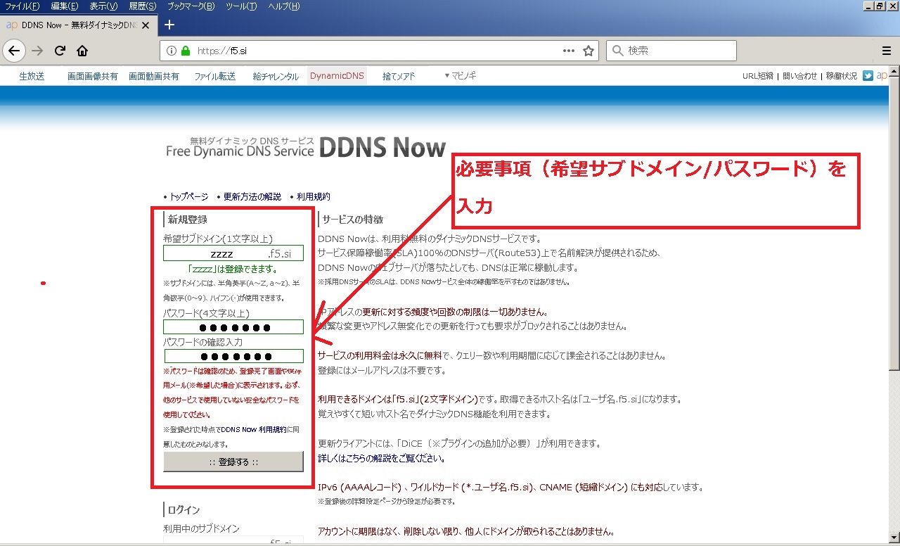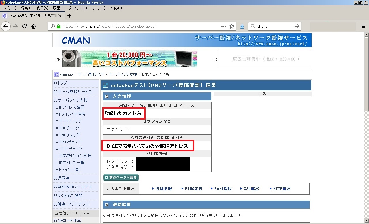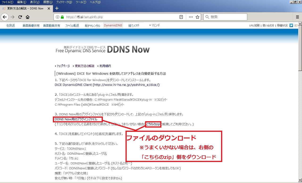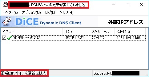 one's way > IPカメラ_NVR > 【NVR】XProtect外部通信用DDNS登録設定及びDiCEのまとめ 【NVR】XProtect外部通信用DDNS登録設定及びDiCEのまとめ IPカメラ_NVR 2018年12月13日 最終更新日:2018/12/13 この記事は無料で利用可能なDDNSの取得・設定方法及び、自動更新ツールDiCEについてまとめたものです。 勿論、用途として色々使い道があるのは知っているのですが、今回はフリーNVRであるXProtectで外部(インターネット上)からアクセスする為に検証したものです。 要は、野外(家の外)から家庭内LANに設置してあるNVRサーバー(XProtect)にアクセスさせる。 その際に、IPアドレスでは無く、FQDN名(ホスト名)でアクセス出来る様にして、外部のIPアドレスが変更されても手間の無い様にすると言う事です。 ○イメージ図 外部IPアドレスは契約元のプロバイダーにより異なりますが、通常は一定期間等で変更されます。 それをフリーウェアのDiCEと言うソフトで更新させるという訳です。 という訳で、その仕組みや設定を行うのに必要な事をまとめています。 0.目次 1.注意事項 2.DDNSとは 3.無料DDNSについて 3-1)DDNS Now 3-2)ieServer 4.DDNSの登録・設定 4-1)DiCEについて 4-2)DDNS Nowの登録・設定 4-2-1)DDNS Nowの登録 4-2-2)DDNS Now用DiCEの導入・設定 4-3)DDNS登録確認 1.注意事項 外部からアクセスは可能ですが、セキュリティには十分ご注意下さい。 当方は一切責任を持てませんので自己責任でお願いします。 2.DDNSとは 簡単に言えば、プロバイダーから割り当てられたIPアドレス(例:111.222.33.44)を"quuta.atgj.net"等の文字に変換してくれるサービスです。 通常、自宅にブロードバンドルータ等を設置し、各プロバイダーのサービスを契約していると思います。 そのブロードバンドルータ側に住所の様な形でIPアドレスが割り当てられているのですが、このIPアドレスは定期的に変更されます。 (有償サービス等で固定させる事も可能です。) 変更されるIPアドレスでは覚え難いと言った事や更新タイミングが各社によって異なるのもあり、それでは不便で仕方ありません。 その為、文字を使用した名前(ドメイン名)が使われる様になりました。 それがDNS(Domain Name System)と言う物で、IPアドレスとドメイン名を紐付けてくれるもので、 DDNSとは更にこの紐付けした内容をDynamic(動的)に行い、使用者が意識せずにドメイン名を使用出来るサービスです。 3.無料DDNSについて 無料なところは数は減ってしまっているのですがいくつかあります。 ※他にもあるとは思いますが、当方はVNRの外部確認用として使用してみようと言う考えですので、 あまり手間をかけずに探しましたところ、とりあえず2箇所ありましたので紹介します。 3.1)DDNS Now [外部サイト]:"https://f5.si/" ドメイン(1種類):f5.si 使用可能なホスト名:ユーザ名.f5.si 契約解除条件:特に無し その他特徴等:IPv6 (AAAAレコード) 、ワイルドカード (*.ユーザ名.f5.si)、 CNAME (短縮ドメイン) 、DiCE対応、登録には電話認証が必要 ※電話認証は後から判明 ※詳細はサービス利用規約を確認して下さい。 3.2)ieServer [外部サイト]:"http://www.ieserver.net/" ドメイン(7種類):dip.jp/fam.cx/jpn.ph/moe.hm/myhome.cx/or.tl/orz.hm 契約解除条件:3ヶ月以上未使用の場合 その他特徴等:DiCE対応、登録にはメールアドレスが必要 ※詳細はサービス利用規約を確認して下さい。 今回はお試しでDDNS Nowを試してみました。 後日、IeServerの方も出来れば試してみたいとは思いますが、時期は未定です。 4)DDNSの登録・設定 4.1)DiCEについて DiCEについて DDNSの登録前に先の説明で出てきたDiCEについて簡単に説明します。 DiCEとは定期的に更新されるIPアドレスをDDNSの登録したドメインで更新ソフトです。 尚、DiCEには無料のFreeware VersionとカンパによるProfessional Versionがあります。 違いはサービス化させてバックグラウンドで稼動させられると言うものですので、興味のある方は公式で詳細を確認して下さい。 ○公式 [外部サイト]:"http://www.hi-ho.ne.jp/yoshihiro_e/dice/" 尚、DDNSを登録後、このソフトもインストール・設定します。 4-2)DDNS Nowの登録・設定 4-2-1)DDNS Nowの登録 ①DDNS Nowの公式サイトを開きます。 ○公式 [外部サイト]:"http://www.hi-ho.ne.jp/yoshihiro_e/dice/" ②左側の「新規登録」にある必要事項(サブドメイン名とパスワード)を入力し、「登録する」をクリックします。 ③電話認証用ページが表示されますので、表示されている番号に電話し、5桁の認証番号を確認後、入力します。 ※認証キーの有効期限は時間は3分です。 ④認証に成功すると、成功しましたページが表示されます。 登録情報等をメールで送信(保存)出来るので、メールアドレスを入力し、「送信」をクリックします。 ※メール保存は任意です。 引き続き、DiCEプラグイン用のファイルをダウンロードします。 ⑤トップページに戻り、「更新方法の解説」をクリックします。 ⑥画面にある、"[Windows] DiCE for Windows を使用してIPアドレスを自動更新する方法"にある内容を確認しながら、「DDNS Now用のプラグインファイル」をクリックし、プラグインファイルを保存し