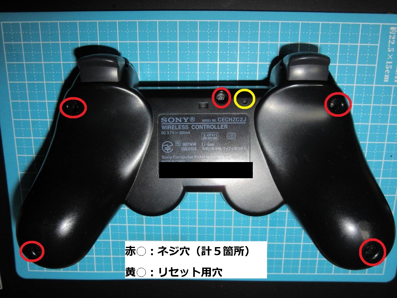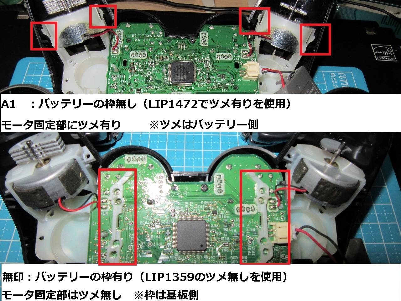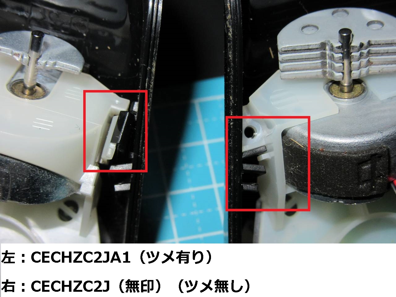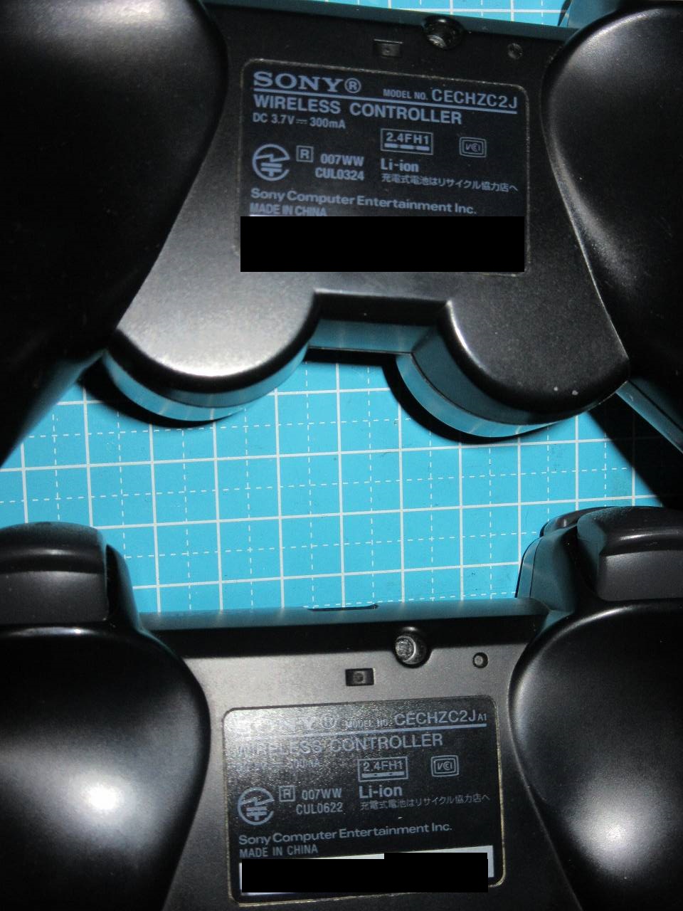 one's way > ジャンクハンター > 【ジャンク】PS3用DUALSHOCK3を2個入手と修理 【ジャンク】PS3用DUALSHOCK3を2個入手と修理 ジャンクハンター 2019年03月15日 最終更新日:2020/02/08 先週末に入手したジャンク品です。 先日、ジャンクのCF-SX1を5000円で入手したブックオフで、ショーケースに入った綺麗目のPS3用のDUALSHOCK3を2個発見。 こちらもジャンクで両方動作不良とありますが、うろ覚えPCでも使えた記憶があったのと1個が税込み350円だったので購入してみました。 ※画像は全てクリックで拡大出来ます。 帰宅後に動作確認をしたところ、確かに勝手に動くので修理もした話です。 0.目次 1.検品 2.分解手順 2-0)共通手順 2-1)ティッシュ等を挟む 2-2)クッション部の修理 3.その他 3-1)リセットボタンの場所 4.まとめ 5.備考 1.検品 ○両方を袋から出したところ 問題無く、電源も入ります。 全く同じなので同じ物かと思ったのですが、裏面の型番が微妙に違っていました。 良くみると必要電力や技適番号等も微妙に異なります。 ○裏面 ○背面情報(1個目)※画像上 型番 CECHZC2J(無印) 電力 DC3.7V 300mA 技適番号 007WWCUL0324 ○背面情報(2個目)※画像下 型番 CECHZC2J A1 電力 DC5V 500mA 技適番号 007WWCUL0622 両方共少し試しましたが、どちらも勝手に動きました。 特に左手と右手をお互い反対方向にネジる様な感じにすると、その事象が酷くなります。 ネットで情報があったのが次の2つ 1)ティシュ等を挟む 2)中にあるクッションをゴム等に交換する 他にも輪ゴムで挟む等もある模様ですが、まずは1)から試してみようと思い、分解・修理してみます。 又、上記2)ではゴムに交換とありますが、まずはクッションの劣化具合をみてみようと思います。 2.分解手順 警告:本内容はメーカの保証外行為を行っております。 その為、本作業を実施した事による機器及びデータの破損・故障等については一切保証せず自己責任となります。 その点を留意頂き、作業願います。 0)共通 ※一部共通の手順があります。 ①背面にある赤○のネジ5本を外します。 ○ネジ及びリセット用穴の位置 ②アナログスティックがある側から上下に開けます。 尚、型番等がある方(背面側)を少し押しながら開けると、開けやすいです。 (その下部にツメがある) 手前が空いたら、L1/L2/R1/R2スイッチがある方に開く様に開けると開きます。 L1/L2及びR1/R2間にある間の黒い部分は注意して下さい。 ③裏側を開いたところです。 灰色のはバッテリーです。 ○裏蓋を開けたところ 尚、2個目も分解した時に判ったのですが、型番が異なるとバッテリーも異なります。 詳細は次の通りです。 ○1個目(画像下) :CECHZC2J(無印) ・基板側にバッテリーの固定具がある ・使用バッテリー :LIP1472 3.7V570mAh(バッテリー自体にはツメが無い) ○2個目(画像上) :CECHZC2J A1 ・基板側にバッテリー固定具が無い ・使用バッテリー :LIP1359 3.7V570MAh(バッテリー自体にツメがある) ○参考:CECHZC2J A1用のバッテリー(LIP1359)(バッテリー自体にツメがある方) ○参考:無印とA1の違い(基板側と固定部の違い) ※ここから手順が分岐します。 1)ティッシュ等を挟む まずは、こちらで試しました。 尚、この方法が良くある方法みたいですが、これで治る場合と治らない場合があります。 ①ティッシュ等を背面に入るサイズに折り、バッテリーの上に乗せる。 尚、ティッシュとありますが、当方はキッチンペーパを使用しました。 但し、あまり厚みがあると、裏蓋が閉まらない可能性があります。 ○キッチンペーパを合わせた例 ②裏蓋を閉じ、ネジ(5箇所)を締めて動作確認をします。 尚、裏蓋はパチっと嵌るので、もし隙間がある場合は、上手く嵌っていない可能性があります。 一度裏蓋を外して付け直す等を行いましょう。 ※当方の固体(2個)は右側(ボタン側)から閉めた方が綺麗に閉めやすい感じがしました。 これで治る場合もあるみたいですが、1台は治り、1台はだめでした。 2)クッション部の修理 こちらはマイナーな手順の模様ですが、こちらの方が治る率は高い模様です。 但し、分解が必要なので難易度は高くなります。 慣れれば隙間から出来なくもないですが、ここでは分解して説明します。 では、手順です。 ①安全の為、バッテリーの外し方ですが、バッテリー端子の台形の部分を両手の人差し指等で引き抜きます。 ※但し、赤・黒の線からは抜かない事(バッテリーが壊れます) ○バッテリーの外し方 ②基板を止めている赤○ネジを外し、下の白プラごと上に持ち上げて外します。 ○基板ネジの位置(中央下部) 尚、持ち上げる際ですが、CECHZC2JA1の方は振動モータ部の両脇にツメで止まっているので外すのを忘れない様にして下さい。 ※(無印は)ツメが有りません。 ○振動部ツメの有無 又、両方とも持ち上げる際にL1/L2・R1/R2ボタンやアナログスティック等にも注意して下さい。 ③基板を外装(表面)から取り外し、白プラと基板を分けたところです。 赤枠の部分がぴったり重なっていると問題ないのですが、そうでないと誤動作の原因になり
