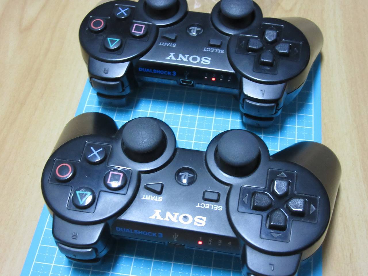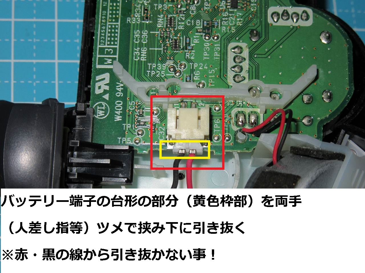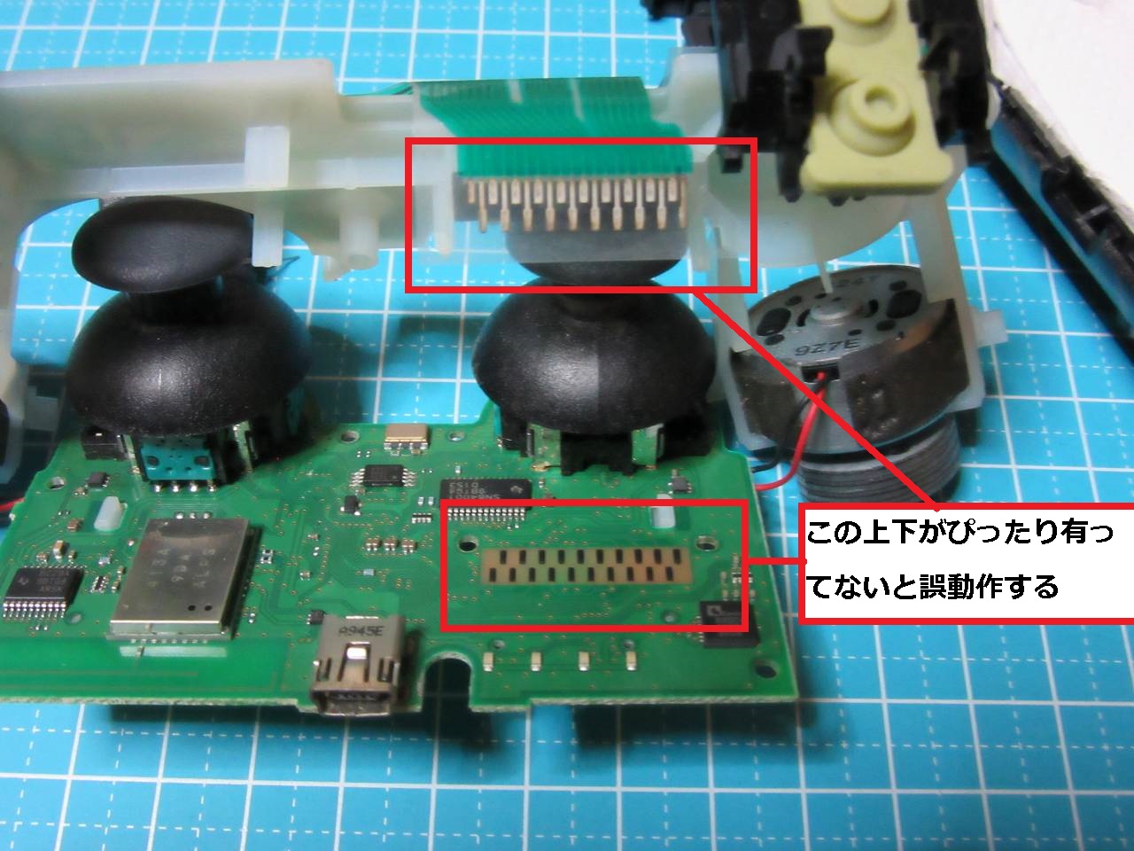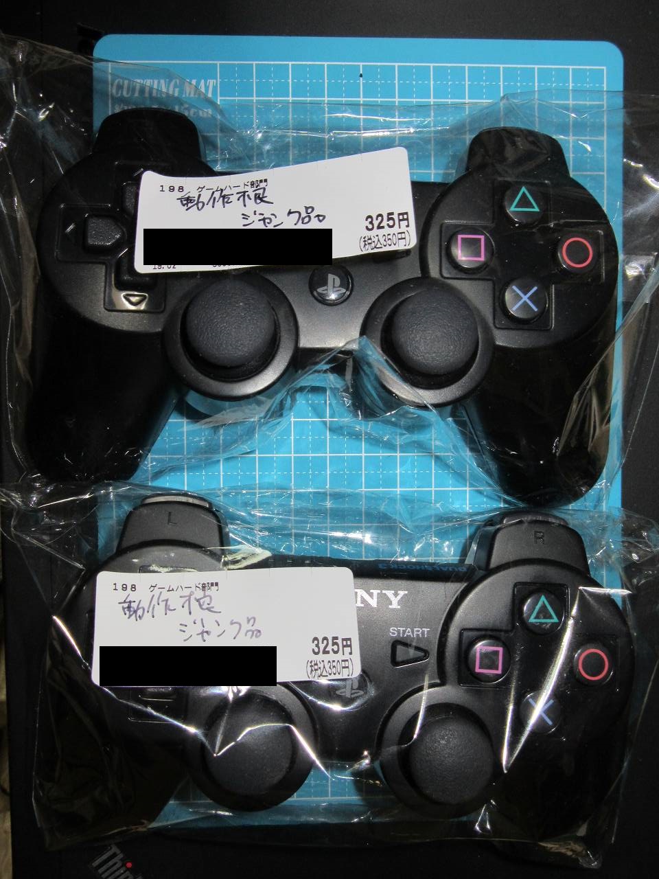 one's way > ジャンクハンター > 【ジャンク】PS3用DUALSHOCK3を2個入手と修理 【ジャンク】PS3用DUALSHOCK3を2個入手と修理 ジャンクハンター 2019年03月15日 最終更新日:2020/02/08 先週末に入手したジャンク品です。 先日、ジャンクのCF-SX1を5000円で入手したブックオフで、ショーケースに入った綺麗目のPS3用のDUALSHOCK3を2個発見。 こちらもジャンクで両方動作不良とありますが、うろ覚えPCでも使えた記憶があったのと1個が税込み350円だったので購入してみました。 ※画像は全てクリックで拡大出来ます。 帰宅後に動作確認をしたところ、確かに勝手に動くので修理もした話です。 0.目次 1.検品 2.分解手順 2-0)共通手順 2-1)ティッシュ等を挟む 2-2)クッション部の修理 3.その他 3-1)リセットボタンの場所 4.まとめ 5.備考 1.検品 ○両方を袋から出したところ 問題無く、電源も入ります。 全く同じなので同じ物かと思ったのですが、裏面の型番が微妙に違っていました。 良くみると必要電力や技適番号等も微妙に異なります。 ○裏面 ○背面情報(1個目)※画像上 型番 CECHZC2J(無印) 電力 DC3.7V 300mA 技適番号 007WWCUL0324 ○背面情報(2個目)※画像下 型番 CECHZC2J A1 電力 DC5V 500mA 技適番号 007WWCUL0622 両方共少し試しましたが、どちらも勝手に動きました。 特に左手と右手をお互い反対方向にネジる様な感じにすると、その事象が酷くなります。 ネットで情報があったのが次の2つ 1)ティシュ等を挟む 2)中にあるクッションをゴム等に交換する 他にも輪ゴムで挟む等もある模様ですが、まずは1)から試してみようと思い、分解・修理してみます。 又、上記2)ではゴムに交換とありますが、まずはクッションの劣化具合をみてみようと思います。 2.分解手順 警告:本内容はメーカの保証外行為を行っております。 その為、本作業を実施した事による機器及びデータの破損・故障等については一切保証せず自己責任となります。 その点を留意頂き、作業願います。 0)共通 ※一部共通の手順があります。 ①背面にある赤○のネジ5本を外します。 ○ネジ及びリセット用穴の位置 ②アナログスティックがある側から上下に開けます。 尚、型番等がある方(背面側)を少し押しながら開けると、開けやすいです。 (その下部にツメがある) 手前が空いたら、L1/L2/R1/R2スイッチがある方に開く様に開けると開きます。 L1/L2及びR1/R2間にある間の黒い部分は注意して下さい。 ③裏側を開いたところです。 灰色のはバッテリーです。 ○裏蓋を開けたところ 尚、2個目も分解した時に判ったのですが、型番が異なるとバッテリーも異なります。 詳細は次の通りです。 ○1個目(画像下) :CECHZC2J(無印) ・基板側にバッテリーの固定具がある ・使用バッテリー :LIP1472 3.7V570mAh(バッテリー自体にはツメが無い) ○2個目(画像上) :CECHZC2J A1 ・基板側にバッテリー固定具が無い ・使用バッテリー :LIP1359 3.7V570MAh(バッテリー自体にツメがある) ○参考:CECHZC2J A1用のバッテリー(LIP1359)(バッテリー自体にツメがある方) ○参考:無印とA1の違い(基板側と固定部の違い) ※ここから手順が分岐します。 1)ティッシュ等を挟む まずは、こちらで試しました。 尚、この方法が良くある方法みたいですが、これで治る場合と治らない場合があります。 ①ティッシュ等を背面に入るサイズに折り、バッテリーの上に乗せる。 尚、ティッシュとありますが、当方はキッチンペーパを使用しました。 但し、あまり厚みがあると、裏蓋が閉まらない可能性があります。 ○キッチンペーパを合わせた例 ②裏蓋を閉じ、ネジ(5箇所)を締めて動作確認をします。 尚、裏蓋はパチっと嵌るので、もし隙間がある場合は、上手く嵌っていない可能性があります。 一度裏蓋を外して付け直す等を行いましょう。 ※当方の固体(2個)は右側(ボタン側)から閉めた方が綺麗に閉めやすい感じがしました。 これで治る場合もあるみたいですが、1台は治り、1台はだめでした。 2)クッション部の修理 こちらはマイナーな手順の模様ですが、こちらの方が治る率は高い模様です。 但し、分解が必要なので難易度は高くなります。 慣れれば隙間から出来なくもないですが、ここでは分解して説明します。 では、手順です。 ①安全の為、バッテリーの外し方ですが、バッテリー端子の台形の部分を両手の人差し指等で引き抜きます。 ※但し、赤・黒の線からは抜かない事(バッテリーが壊れます) ○バッテリーの外し方 ②基板を止めている赤○ネジを外し、下の白プラごと上に持ち上げて外します。 ○基板ネジの位置(中央下部) 尚、持ち上げる際ですが、CECHZC2JA1の方は振動モータ部の両脇にツメで止まっているので外すのを忘れない様にして下さい。 ※(無印は)ツメが有りません。 ○振動部ツメの有無 又、両方とも持ち上げる際にL1/L2・R1/R2ボタンやアナログスティック等にも注意して下さい。 ③基板を外装(表面)から取り外し、白プラと基板を分けたところです。 赤枠の部分がぴったり重なっていると問題ないのですが、そうでないと誤動作の原因になり