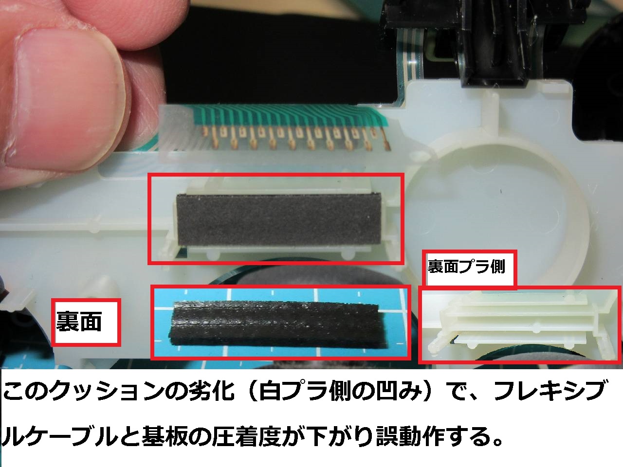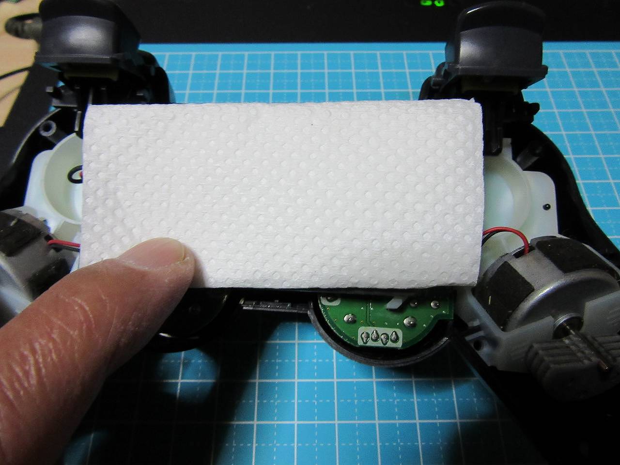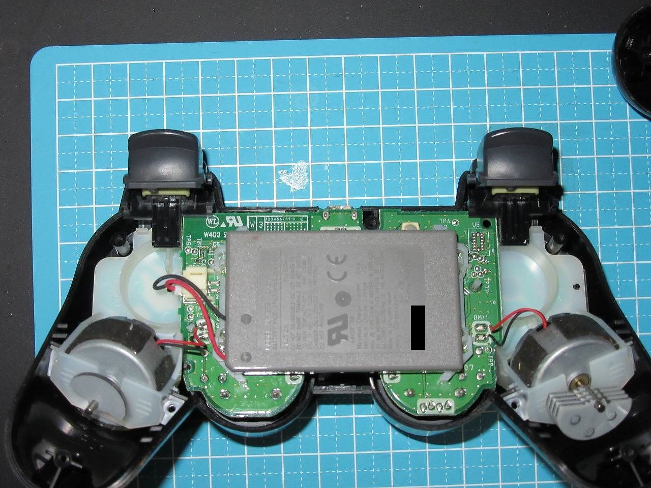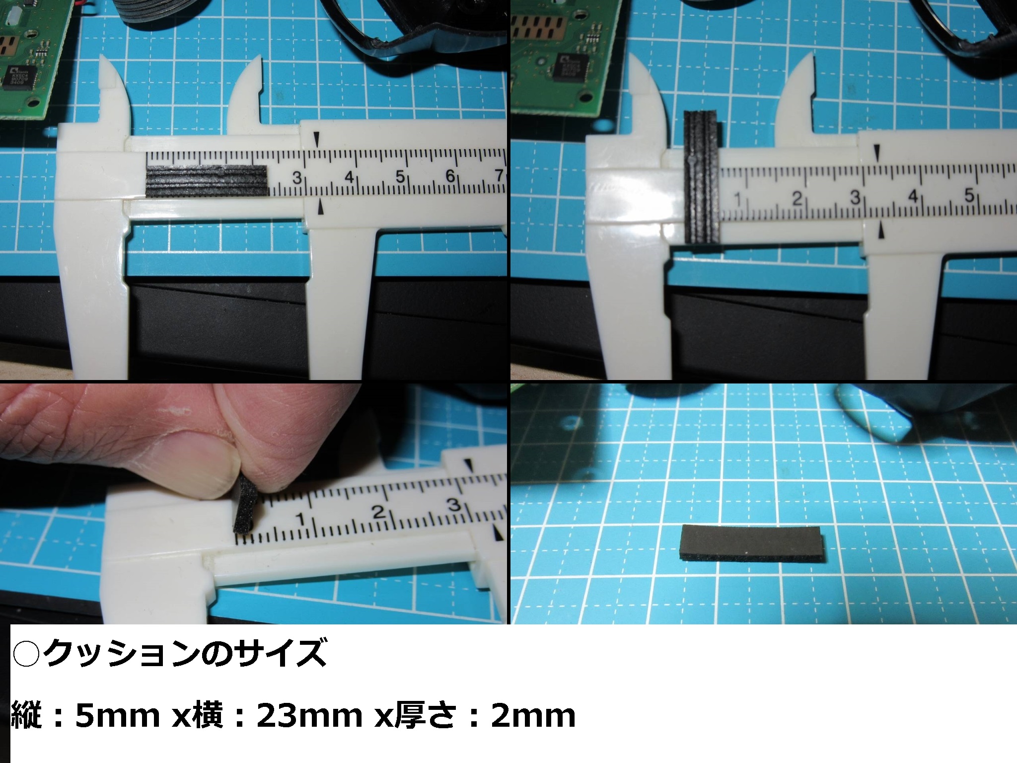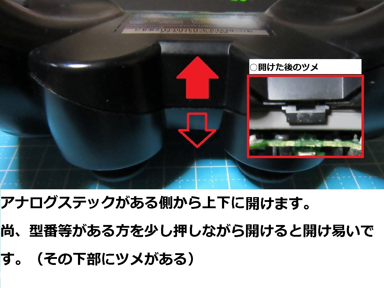 one's way > ジャンクハンター > 【ジャンク】PS3用DUALSHOCK3を2個入手と修理 【ジャンク】PS3用DUALSHOCK3を2個入手と修理 ジャンクハンター 2019年03月15日 最終更新日:2020/02/08 先週末に入手したジャンク品です。 先日、ジャンクのCF-SX1を5000円で入手したブックオフで、ショーケースに入った綺麗目のPS3用のDUALSHOCK3を2個発見。 こちらもジャンクで両方動作不良とありますが、うろ覚えPCでも使えた記憶があったのと1個が税込み350円だったので購入してみました。 ※画像は全てクリックで拡大出来ます。 帰宅後に動作確認をしたところ、確かに勝手に動くので修理もした話です。 0.目次 1.検品 2.分解手順 2-0)共通手順 2-1)ティッシュ等を挟む 2-2)クッション部の修理 3.その他 3-1)リセットボタンの場所 4.まとめ 5.備考 1.検品 ○両方を袋から出したところ 問題無く、電源も入ります。 全く同じなので同じ物かと思ったのですが、裏面の型番が微妙に違っていました。 良くみると必要電力や技適番号等も微妙に異なります。 ○裏面 ○背面情報(1個目)※画像上 型番 CECHZC2J(無印) 電力 DC3.7V 300mA 技適番号 007WWCUL0324 ○背面情報(2個目)※画像下 型番 CECHZC2J A1 電力 DC5V 500mA 技適番号 007WWCUL0622 両方共少し試しましたが、どちらも勝手に動きました。 特に左手と右手をお互い反対方向にネジる様な感じにすると、その事象が酷くなります。 ネットで情報があったのが次の2つ 1)ティシュ等を挟む 2)中にあるクッションをゴム等に交換する 他にも輪ゴムで挟む等もある模様ですが、まずは1)から試してみようと思い、分解・修理してみます。 又、上記2)ではゴムに交換とありますが、まずはクッションの劣化具合をみてみようと思います。 2.分解手順 警告:本内容はメーカの保証外行為を行っております。 その為、本作業を実施した事による機器及びデータの破損・故障等については一切保証せず自己責任となります。 その点を留意頂き、作業願います。 0)共通 ※一部共通の手順があります。 ①背面にある赤○のネジ5本を外します。 ○ネジ及びリセット用穴の位置 ②アナログスティックがある側から上下に開けます。 尚、型番等がある方(背面側)を少し押しながら開けると、開けやすいです。 (その下部にツメがある) 手前が空いたら、L1/L2/R1/R2スイッチがある方に開く様に開けると開きます。 L1/L2及びR1/R2間にある間の黒い部分は注意して下さい。 ③裏側を開いたところです。 灰色のはバッテリーです。 ○裏蓋を開けたところ 尚、2個目も分解した時に判ったのですが、型番が異なるとバッテリーも異なります。 詳細は次の通りです。 ○1個目(画像下) :CECHZC2J(無印) ・基板側にバッテリーの固定具がある ・使用バッテリー :LIP1472 3.7V570mAh(バッテリー自体にはツメが無い) ○2個目(画像上) :CECHZC2J A1 ・基板側にバッテリー固定具が無い ・使用バッテリー :LIP1359 3.7V570MAh(バッテリー自体にツメがある) ○参考:CECHZC2J A1用のバッテリー(LIP1359)(バッテリー自体にツメがある方) ○参考:無印とA1の違い(基板側と固定部の違い) ※ここから手順が分岐します。 1)ティッシュ等を挟む まずは、こちらで試しました。 尚、この方法が良くある方法みたいですが、これで治る場合と治らない場合があります。 ①ティッシュ等を背面に入るサイズに折り、バッテリーの上に乗せる。 尚、ティッシュとありますが、当方はキッチンペーパを使用しました。 但し、あまり厚みがあると、裏蓋が閉まらない可能性があります。 ○キッチンペーパを合わせた例 ②裏蓋を閉じ、ネジ(5箇所)を締めて動作確認をします。 尚、裏蓋はパチっと嵌るので、もし隙間がある場合は、上手く嵌っていない可能性があります。 一度裏蓋を外して付け直す等を行いましょう。 ※当方の固体(2個)は右側(ボタン側)から閉めた方が綺麗に閉めやすい感じがしました。 これで治る場合もあるみたいですが、1台は治り、1台はだめでした。 2)クッション部の修理 こちらはマイナーな手順の模様ですが、こちらの方が治る率は高い模様です。 但し、分解が必要なので難易度は高くなります。 慣れれば隙間から出来なくもないですが、ここでは分解して説明します。 では、手順です。 ①安全の為、バッテリーの外し方ですが、バッテリー端子の台形の部分を両手の人差し指等で引き抜きます。 ※但し、赤・黒の線からは抜かない事(バッテリーが壊れます) ○バッテリーの外し方 ②基板を止めている赤○ネジを外し、下の白プラごと上に持ち上げて外します。 ○基板ネジの位置(中央下部) 尚、持ち上げる際ですが、CECHZC2JA1の方は振動モータ部の両脇にツメで止まっているので外すのを忘れない様にして下さい。 ※(無印は)ツメが有りません。 ○振動部ツメの有無 又、両方とも持ち上げる際にL1/L2・R1/R2ボタンやアナログスティック等にも注意して下さい。 ③基板を外装(表面)から取り外し、白プラと基板を分けたところです。 赤枠の部分がぴったり重なっていると問題ないのですが、そうでないと誤動作の原因になり