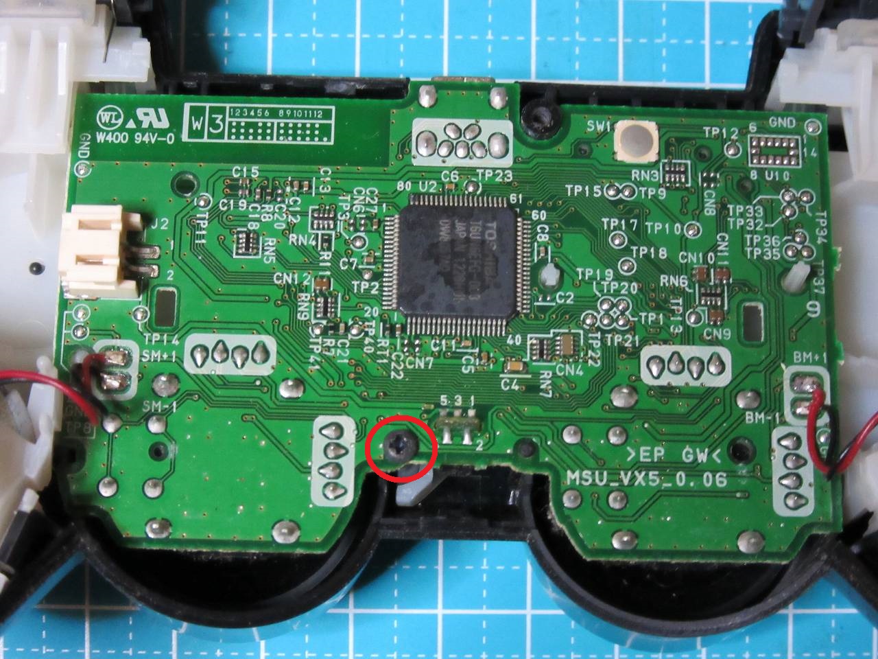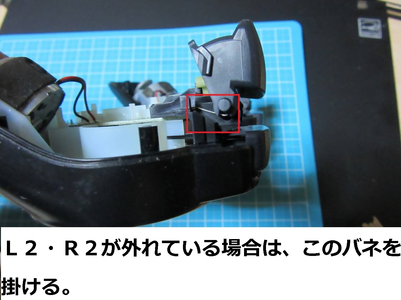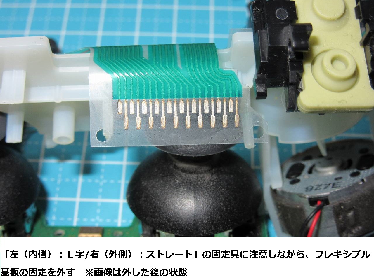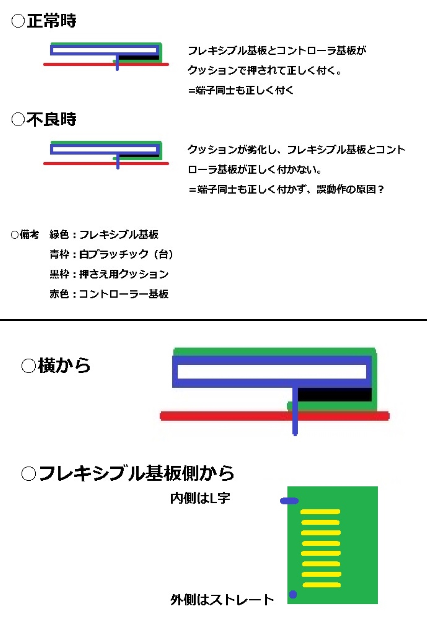 one's way > ジャンクハンター > 【ジャンク】PS3用DUALSHOCK3を2個入手と修理 【ジャンク】PS3用DUALSHOCK3を2個入手と修理 ジャンクハンター 2019年03月15日 最終更新日:2020/02/08 先週末に入手したジャンク品です。 先日、ジャンクのCF-SX1を5000円で入手したブックオフで、ショーケースに入った綺麗目のPS3用のDUALSHOCK3を2個発見。 こちらもジャンクで両方動作不良とありますが、うろ覚えPCでも使えた記憶があったのと1個が税込み350円だったので購入してみました。 ※画像は全てクリックで拡大出来ます。 帰宅後に動作確認をしたところ、確かに勝手に動くので修理もした話です。 0.目次 1.検品 2.分解手順 2-0)共通手順 2-1)ティッシュ等を挟む 2-2)クッション部の修理 3.その他 3-1)リセットボタンの場所 4.まとめ 5.備考 1.検品 ○両方を袋から出したところ 問題無く、電源も入ります。 全く同じなので同じ物かと思ったのですが、裏面の型番が微妙に違っていました。 良くみると必要電力や技適番号等も微妙に異なります。 ○裏面 ○背面情報(1個目)※画像上 型番 CECHZC2J(無印) 電力 DC3.7V 300mA 技適番号 007WWCUL0324 ○背面情報(2個目)※画像下 型番 CECHZC2J A1 電力 DC5V 500mA 技適番号 007WWCUL0622 両方共少し試しましたが、どちらも勝手に動きました。 特に左手と右手をお互い反対方向にネジる様な感じにすると、その事象が酷くなります。 ネットで情報があったのが次の2つ 1)ティシュ等を挟む 2)中にあるクッションをゴム等に交換する 他にも輪ゴムで挟む等もある模様ですが、まずは1)から試してみようと思い、分解・修理してみます。 又、上記2)ではゴムに交換とありますが、まずはクッションの劣化具合をみてみようと思います。 2.分解手順 警告:本内容はメーカの保証外行為を行っております。 その為、本作業を実施した事による機器及びデータの破損・故障等については一切保証せず自己責任となります。 その点を留意頂き、作業願います。 0)共通 ※一部共通の手順があります。 ①背面にある赤○のネジ5本を外します。 ○ネジ及びリセット用穴の位置 ②アナログスティックがある側から上下に開けます。 尚、型番等がある方(背面側)を少し押しながら開けると、開けやすいです。 (その下部にツメがある) 手前が空いたら、L1/L2/R1/R2スイッチがある方に開く様に開けると開きます。 L1/L2及びR1/R2間にある間の黒い部分は注意して下さい。 ③裏側を開いたところです。 灰色のはバッテリーです。 ○裏蓋を開けたところ 尚、2個目も分解した時に判ったのですが、型番が異なるとバッテリーも異なります。 詳細は次の通りです。 ○1個目(画像下) :CECHZC2J(無印) ・基板側にバッテリーの固定具がある ・使用バッテリー :LIP1472 3.7V570mAh(バッテリー自体にはツメが無い) ○2個目(画像上) :CECHZC2J A1 ・基板側にバッテリー固定具が無い ・使用バッテリー :LIP1359 3.7V570MAh(バッテリー自体にツメがある) ○参考:CECHZC2J A1用のバッテリー(LIP1359)(バッテリー自体にツメがある方) ○参考:無印とA1の違い(基板側と固定部の違い) ※ここから手順が分岐します。 1)ティッシュ等を挟む まずは、こちらで試しました。 尚、この方法が良くある方法みたいですが、これで治る場合と治らない場合があります。 ①ティッシュ等を背面に入るサイズに折り、バッテリーの上に乗せる。 尚、ティッシュとありますが、当方はキッチンペーパを使用しました。 但し、あまり厚みがあると、裏蓋が閉まらない可能性があります。 ○キッチンペーパを合わせた例 ②裏蓋を閉じ、ネジ(5箇所)を締めて動作確認をします。 尚、裏蓋はパチっと嵌るので、もし隙間がある場合は、上手く嵌っていない可能性があります。 一度裏蓋を外して付け直す等を行いましょう。 ※当方の固体(2個)は右側(ボタン側)から閉めた方が綺麗に閉めやすい感じがしました。 これで治る場合もあるみたいですが、1台は治り、1台はだめでした。 2)クッション部の修理 こちらはマイナーな手順の模様ですが、こちらの方が治る率は高い模様です。 但し、分解が必要なので難易度は高くなります。 慣れれば隙間から出来なくもないですが、ここでは分解して説明します。 では、手順です。 ①安全の為、バッテリーの外し方ですが、バッテリー端子の台形の部分を両手の人差し指等で引き抜きます。 ※但し、赤・黒の線からは抜かない事(バッテリーが壊れます) ○バッテリーの外し方 ②基板を止めている赤○ネジを外し、下の白プラごと上に持ち上げて外します。 ○基板ネジの位置(中央下部) 尚、持ち上げる際ですが、CECHZC2JA1の方は振動モータ部の両脇にツメで止まっているので外すのを忘れない様にして下さい。 ※(無印は)ツメが有りません。 ○振動部ツメの有無 又、両方とも持ち上げる際にL1/L2・R1/R2ボタンやアナログスティック等にも注意して下さい。 ③基板を外装(表面)から取り外し、白プラと基板を分けたところです。 赤枠の部分がぴったり重なっていると問題ないのですが、そうでないと誤動作の原因になり