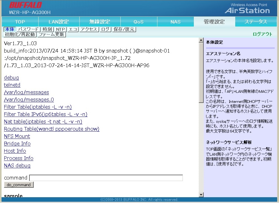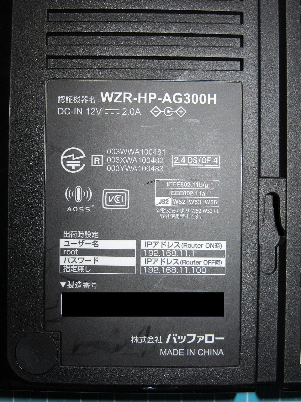 | 無線 | 2.4Ghz:n/g/b(1~13ch) 5Ghz:n/a(W52/W53/W56) |