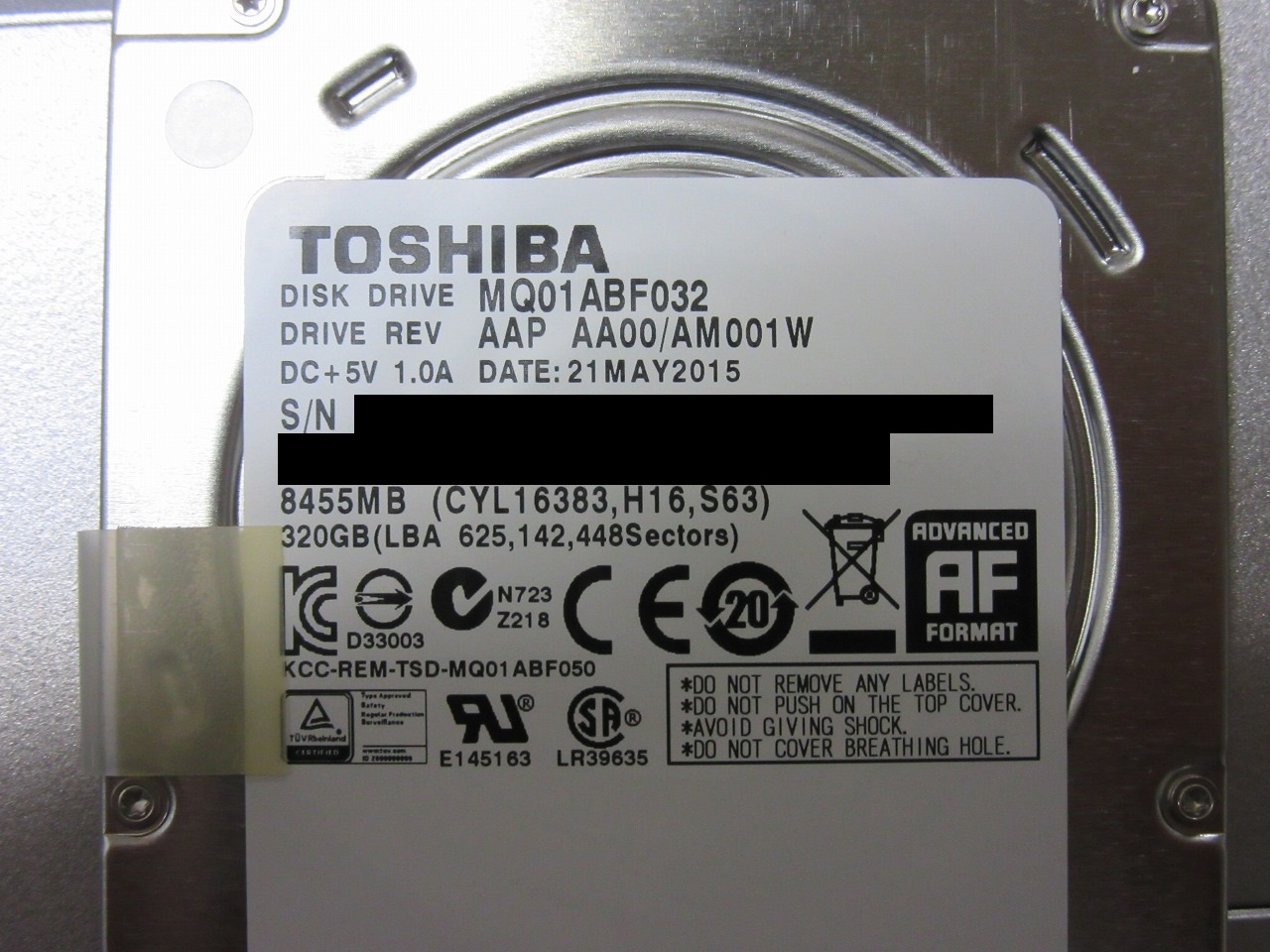 | HDD | TOSHIBA MQ01ABF032 320GB/5,400 rpm (2.5インチ7mm/キャッシュ8 MiB) |