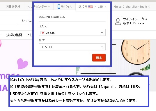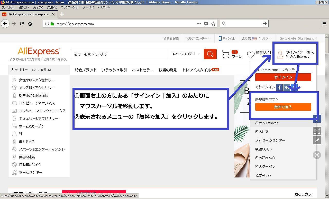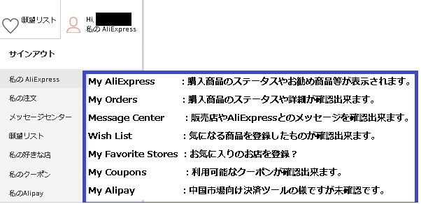 | My AliExpress | 購入商品のステータスやお勧め商品等が表示されます。 |