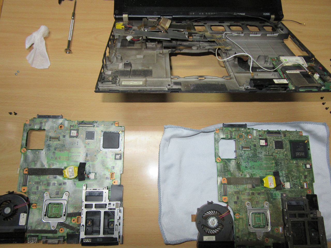 one's way > PC(ハード) > 【PC】x200の移植作業 【PC】x200の移植作業 PC(ハード) 2018年03月04日 去年の夏から放置していたx200の液晶部不良ですが、漸く修理しました。 過去の記事:【PC】x200の画面表示不良を仮復旧させる と言っても、最初に使用していたx200(お茶をこぼして故障)の筐体に画面のおかしくなったx200のシステムボード部を交換するのみ。 ○分解作業中の一コマ 左は普段使い、右上は不良を集める物、右下は動作品を集める物 手順は、Lenovoから保守マニュアル(分解手順)が公開されており、ネット上でも他の方の記事が多数あるのでどちらかと言うと簡単な分類。 (と言う訳で、今回は解説はありません。) ○システムボードを取り外したところ ○参考:ThinkPad X200 および X200s 保守マニュアル 交換ついでに、動く方のメンテナンス(清掃とCPUグリス塗りなおし)をして動作確認。 問題無く使える様になりました。 ○正常なシステムボードのCPU等(メンテナンス前) NECのVersaProも製造はLenovo系のはずなのに、保守容易性は雲泥の差。 このぐらい簡単であれば人気がでたと思うのになぁ。。 ちなみに故障したx200には3GBメモリ(2GB+1GB)と、160GBのHDDが挿したままでした。 残念ながら、メモリはPC3-8500(DDR3-1066)、HDDはSATA1(5400rpm/SATA1:1.5G)でしたが、検証用に使うなら十分かもしれないですね。。 其の前に暇な時にパーツの在庫整理をしないと・・・ 以上 タグもどき: thinkpad x200 トラブル 分解 保守マニュアル 修理 メンテナンス PR