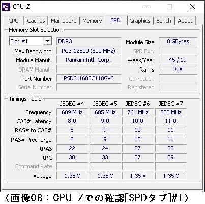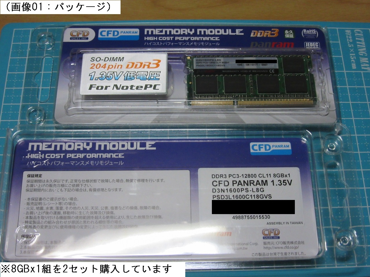 one's way > PC(ハード) > 【DDR-3L】CFD(Panram) メモリー(16GB)への換装(D3N1600PS-L8Gx2) 【DDR-3L】CFD(Panram) メモリー(16GB)への換装(D3N1600PS-L8Gx2) PC(ハード) 2019年12月14日 最終更新日:2019/12/14 先日のAmazonサイバーマンデーで安売りしていたCFD(Panram)製DDR-3Lメモリを入手・検証してみた話です。 購入した型番はD3N1600PS-L8G(1枚組)で2セット購入しました。 本製品は2枚組もあるのになぜ単品(1枚組)を2セットにしたのかも含めてのお話です。 ○CFD(Panram) D3N1600PS-L8Gx2枚 0.目次 1.経緯 2.選定 2-1)選定条件 2-2)メーカ選定について 2-3)購入方法について 3.検品 4.検証 4-1)Lenovo X220での動作確認 4-2)NEC VK26M/B-Fでの動作確認 4-3)Panasonic CF-NX4での動作確認 5.評価 6.まとめ 1.経緯 元々、NECのノートPC(VK26M/B-F)用を8GBx2の16GB化したくて様子を見ていたのですが、 ここ最近特に安くなった為です。 そして先日のサイバーマンデーの日は更に値下がりしていたので、思わずポチってしまいました。 2.選定 現在、Lenovo x220に装着しているTrancend製の実績もあるので、今回も同じ型番にしようと思っていたのですが、値段の関係で断念し再選定を行いました。 まず、条件は次の通りです。 2-1)選定条件 ・ノートPC用DDR3型の省電力タイプ(つまり1.35VのL付き) →DDR3L-12800が現在のDDR3系で主流と思います。 ・容量は該当機種の対応CPUの上限である8GBx2枚の合計16GB化 尚、換装対象としては以下の①又は②の2台のどちらかであるが、他にもやりたい事はあるので今回は1台分のみ増設し、残り1台は8GB(4GBx2)のままとする。 (SSDへの換装とかもしたいのですがね・・) ○現在所有しているPCと現状 ・今回の増強予定対象 ①NEC Versarpro VK26M/B-F(#1)[PC-VK26MBZCF](Corei5-3320M/Ivy Bridge) →現状:PC3L-12800/4GBx2枚の8MB ②NEC Versarpro VK26M/B-F(#2)[PC-VK26MBZCF](Corei5-3320M/Ivy Bridge) →現状:PC3L-12800/4GB+2GBの6MB ③Panasonic CF-NX4[CF-NX4EDHCS](Corei5-5300U/Broadwell) →現状:PC3L-12800/4GBx1枚の4GB ※このCF-NX4ですが、実はメモリーをポチった後に見つけて買ってしまいました・・ 尚、ジャンクなので、いつもの通り弄る予定です(記事は後日の予定) ・増強済み ③Lenovo x220[4290-KF4](Corei7-2640M/Sandy Bridge) ※PC3L-12800/8GBx2枚の16GB化済(CPUの上限) ④Panasonic CF-SX1[CF-SX1HECDP](Corei7-2640M/Sandy Bridge) ※PC3L-10600/8GBx2枚の16GB化済(CPUの上限) ⑤Lenovo x200[7457-4PJ](Core2 Duo P8400) ※PC3L-12800/4GBx2枚の8GB化済(CPUの上限)※本製品では対象外 と言う事でメモリをポチった際にはVK26M/B-Fで使用する予定ですが、急遽CF-NX4で使う可能性が高いです。 2-2)メーカ選定について 当方の過去の使用実績や現在の人気及び価格・信頼度を比較し、次の候補から選択する事とした。 a)メーカ候補 ①シリコンパワー(SP008GLSTU160N02) ②CFD(Panram) (D3N1600PS-L8G) ③キングストン(KVR16LS11K2) ④Crucial-Micron(CT2KIT102464BF160B) b)使用実績(公私両方) ・①/②/③ ※家ではTrancend、仕事ではシリコンパワーやキングストンのメモリ等も良く見ています。 実施はそれ以外にもあるのですが信頼性の観点から除外しています。 c)信頼度 ・③・④<①<② d)保証 ・永久保証である →全て対象 e)価格 購入当日の値段を比較 先の通りサイバーマンデーであったのでその価格で決定しました。 上記を比較検討の結果、ノートPC用でありオーバークロック等の過酷な使用方法では無い点から値段の安かった本製品としました。 但し、デスクトップでオーバークロックを行うのであれば信頼度のある方を選択した可能性はあります。 2-3)購入方法について 単純に8GBx2枚の1組でも良かったが、翌々調べると8GBx1枚を2組購入した方が合計金額が安かった為、後者を選択。 尚、2枚1組と1枚2組の違いについては細かい点(相性問題の可能性等)は多少あるが、問題ないと判断しました。 この辺りは、その時によって値段が変わる可能性があるので、各自で確認された方が良いと思います。 それらの結果、今回の製品であるCFD(Panram)社製D3N1600PS-L8Gx2組となった次第です。 3.検品 先の通り、当方は省電力型の8GBx1枚を2組購入した為、パッケージは2個あります。 ○パッケージ ○メモリの両面 尚、内容物はメモリのみで、型番はD3N1600PS-L8Gで低電圧(1.35V)の物と間違いありませんでした。 ○製品情報の拡大 尚、Amazonの商品ページの画像と異なりますが、チップは片面8個の両面16個のタイプです。 (商品ページの画像1・2は片面4個(両面8個)タイプ) 4.検証 不良品で無いかを確認する為、PCに装着してみました。 尚、本来なら当初の予定通りNECのPC(①又は②)に装着するのが一番なのですが、本体を分解しないといけない為、まずはメモリの着脱が簡単なx220で確認を実施 問題なければ、後日時間のある時にNECのPCに換装する事とした。 4-1)Lenovo X220での動作確認 ○使用ハード ・Lenovo x220[4290-KF4](Corei7-2640M/Sandy Bridge) ○条件 以下の状況で確認 ・OS:Windows10 Pro 64Bit ・CPU-Z:V 1.90.0.x64 ・作業前のメモリ容量:8GBx2(Trancend製) ※動作確認の為、一時的に交換 ○結果 特に問題無く、BIOS/OS上及びCPU-Zからも16GBを認識しました。 ○メモリ装着の様子 ※背面から2スロット交換可能なのはやはり便利ですよ