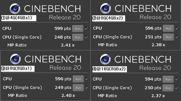 | ① | 4GBx1枚 | 4GB | シングルチャネル |