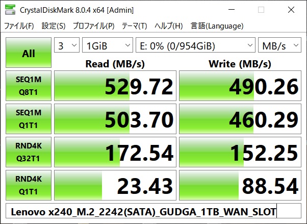 one's way > PC(ハード) > 【AliExpress】M.2 2242 SATA 1TBを買ってみたお話 【AliExpress】M.2 2242 SATA 1TBを買ってみたお話 PC(ハード) 2023年04月11日 最終更新日:2023/04/11 なんだか久しぶりにBlogを書く気がします・・・。 (本当はこまめにしたいところなのですが、そこまで手が回らず・・) そんな中、先月、久しぶりに海外通販のAliexpressで買い物をした話です。 (前回Aliexpressを使ったのは、購入履歴を遡ると2021/06/13でした・・) その時はLenovo Thinkpad X240のCPU FANを注文したのですが、新品のはずが中古(しかも無理矢理剥がした感じで折れていたりと散々な品)が来て、当然返送して返金要求しました。 しかしながら、コロナの関係で到着がギリギリなのと、相手がワザと受け取りしていない感じでもめたので、最終的に紛争して勝利し、Aliexpressの判定で全額返金してもらいました。 そこでコロナの影響での輸送関連が落ち着くまでは様子をみようと今に至った次第です。 0.目次 1.購入製品の説明等 2.検品 3.Lenovo Thinkpad X240による検証 3-1)X240への装着等 3-2)動作確認 4.まとめ 1.購入製品の説明等 そんな中、偶々セールをやっていてポチってしまったのがこの製品です。 〇製品名 ・Gudga ssd M2 sata 22*42ミリメートルM.2 ngff の1TB版です。 タイプはM.2でKeyはB&M、サイズが2242のSATAで容量は1TBと言う物です。 ※製品の様子 〇目的 なぜ2280では無く2242を選んだかの目的としては一部のPCで比較的空いている(余っているWAN端子)に刺して使えるかも含めて確認をしたかったからです。 〇何故、Aliexpressを利用したか? 今回、Amazonでは無く、AliExpressを利用したかの理由は幾つかあります。 ①サイズが2242なのでAmazonより、Aliexoressの方が品ぞろえが良かった ②セールでAliexoressの方が安かった 特に②の方は、当初512GBにしようと思っていたのですが、セールだったので奮発して1TBにしたくらいですから・・。 〇発送について セールだったからかは不明ですが、納期保証と10日以内の発送保証があったからですね。 尚、問題無く到着しました。 又、支払いについてはPaypal経由でクレジット払いにしておきました。 (その方がトラブルがあってもPaypalとAliexpressと2つで守られますんで・・) 2.検品 2-1)検品 まず、パッケージと開封後の様子です。 〇パッケージの様子 〇開封後の様子 開封後の内容物は以下の通りでした。 〇内容物 ①M.2 2242 SATA SSD 1TB(本体) ②取付用ネジ 以下、特記事項のある項目について記載します。 ①M.2 2242 SATA SSD 1TB(本体) 冒頭でも少し書きましたが、製品名が"Gudga ssd M2 sata 22*42ミリメートルM.2 ngff" の1TB版です。 タイプはM.2でKeyはB&M、サイズが2242のSATAで容量は1TBと言う物です。 チップは両面実装な感じですかね。 〇両面の様子 ②取付用ネジ 1個付属していました。 只、PCの機種等によってはカードが無くても付いてる事もあるので、無ければ使う感じでしょうか・・? 3.Lenovo Thinkpad X240による検証 3-1)X240への装着等 と言う訳で早速検証(動作確認)です。 何故、今回X240にしたかと言うと、先人の方の知恵(ブログ等)でWanスロットでのM.2 2242 SATA SSDの動作報告があった為です。 (この手の製品で、非対応の場合に切り分けをしないといけないからです。) と、言うことで以下がX240を分解して装着してみた様子です。 ※内蔵バッテリーはBIOS上で必ずOFFにしてから作業をして下さい。 又、実施については自己責任でお願いします。 装着時の感想としては、やはり前例があるのであっけなく装着できました。 〇X240のWANスロットへの装着時の様子 ※隣のは無線LANカード 後はBIOS、OS等からの様子とCrystalDiskInfoやCrystalDiskMark等による様子です。 3-2)動作確認 ①BIOS上での様子 →問題無く認識していました。※GN1TBと表示 〇BIOS画面(Startup) ②OS上からの様子 →初回はDISKの管理からのパーティションやフォーマット等を行う必要がありますが、特に問題はありませんでした。 ③CrystalDiskInfoによる確認 ※総書き込み容量が等が20GBを超えていますが、CrystalDiskMarkを先にした関係です・・ →こちらも問題無くSATA3で認識していました。 〇CrystalDiskInfoの様子 ④CrystalDiskMarkによる計測 →SEQ-Readが約500MB/s、SEQ-Writeが約480MB/sとWriteが少しだけ低い感じですが、SATA接続なので許容範囲でしょうか・・? 〇CrystalDiskMarkの様子 4.まとめ と言うことで、今回のX240についてはWanスロットでのM.2 2242 SATA SSDは動作可能だったのと、今回購入したM.2 2242 SATA SSD自体も(今のところは)問題が無い事が確認出来ました。 このSSDで気になる点としては、TBW等が公開されていないところや保証等の問題もあるかもしれませんが、セール等での値段次第ではアリかな?と思う品でした。(Amazonだと2242自体が超高額なので・・) 後は現時点で動作確認が取れたのが今回のX240だけですが、後日手持ちのPC等での情報を追加出来ればと思っています。 (本ページに追加か分けるかは考え中) 以上 〇更新履歴 2024/04/11 初版 タグもどき: Lenovo X240 WAN M.2 2242 SATA SSD DISK交換 解説 分解 PR