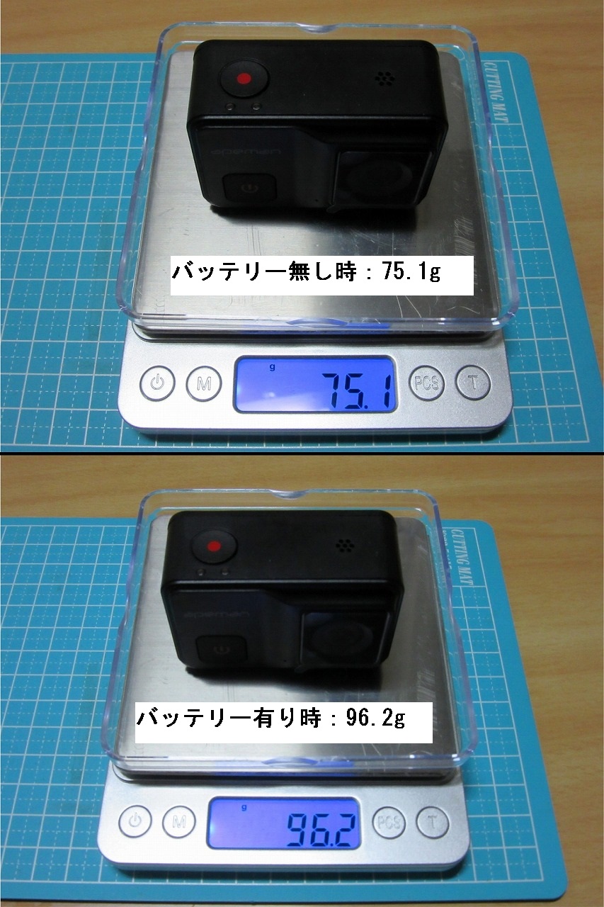 | 重量(本体) | 75.1g/96.2g(バッテリー無し時/バッテリー装着時) |