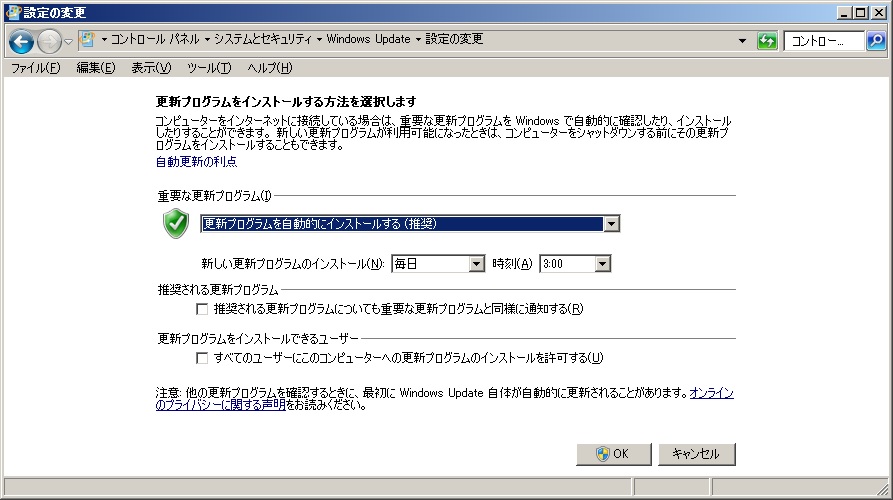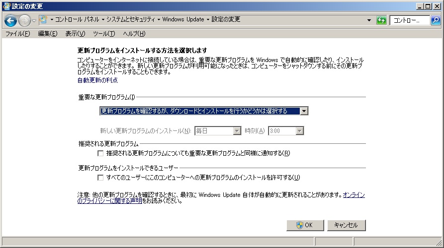 (「スタート」-「コントロールパネル」-「システムとセキュリティ」-「Windows Update」-「設定の変更」)