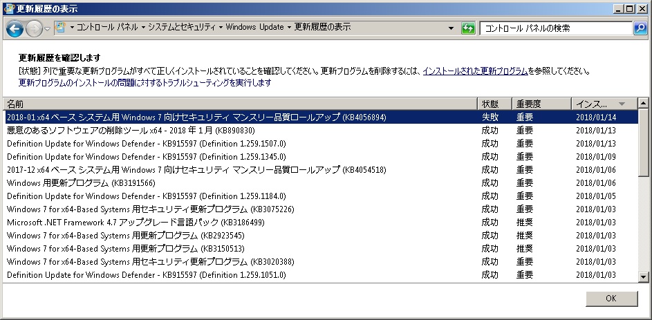 【セキュリティ】Windows7(64Bit)でKB4056894の更新に失敗する