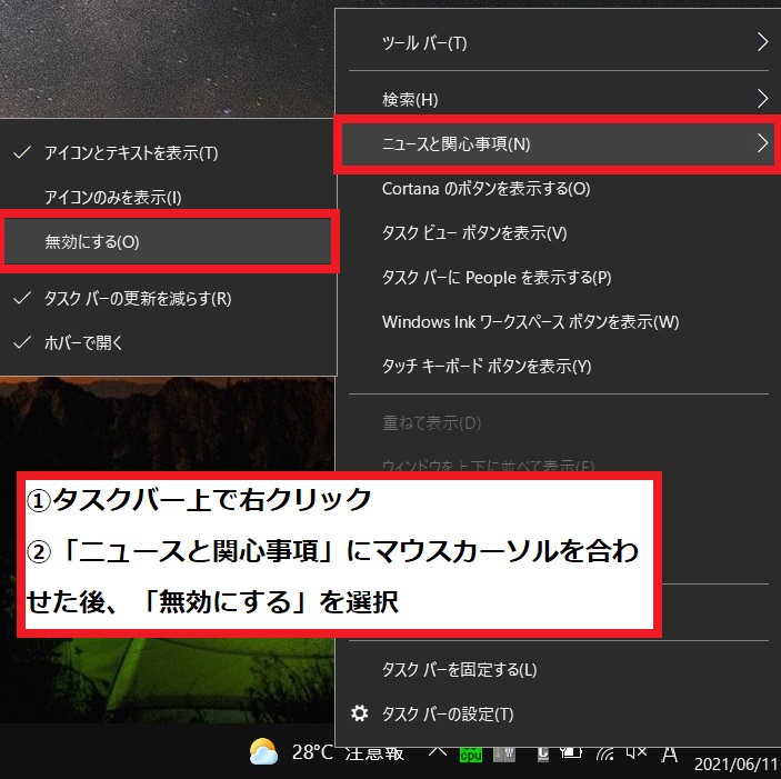 | reg add "HKEY_CURRENT_USER\SOFTWARE\Microsoft\Windows\CurrentVersion\Feeds" /v ShellFeedsTaskbarViewMode /t "REG_DWORD" /d "2" /f |