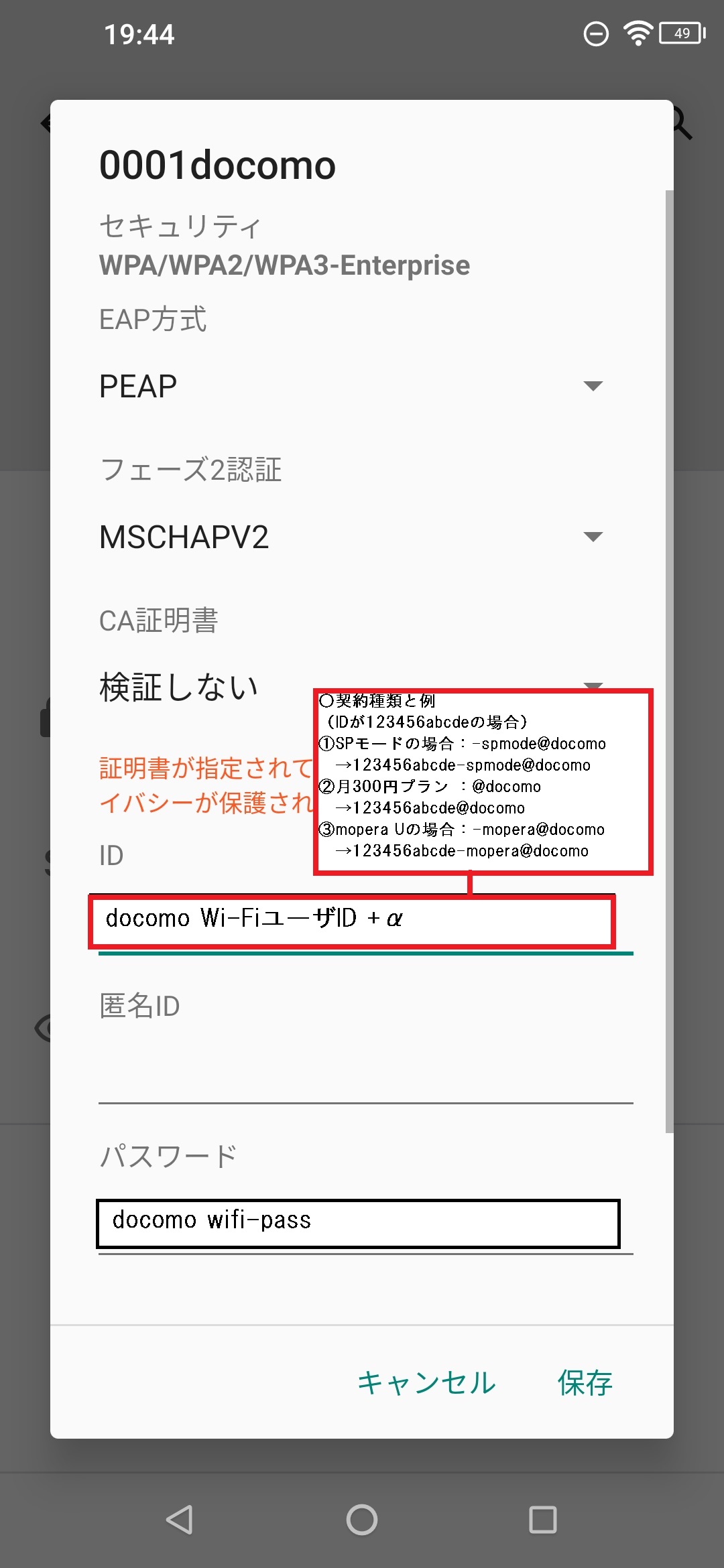 | ID | ①docomo Wi-Fiの場合 ドコモから発行されたID+契約種類の指定 ○契約種類と例 ※IDが123456abcdeの場合 ・SPモードの場合:-spmode@docomo →123456abcde-spmode@docomo ・月300円プラン :@docomo →123456abcde@docomo ・mopera Uの場合:-mopera@docomo →123456abcde-mopera@docomo ②d Wi-Fiの場合 dアカウント-dwifi@docomo ○例 ※dアカウントがaaa@docomo.ne.jpの場合 →aaa@docomo.ne.jp-dwifi@docomo |