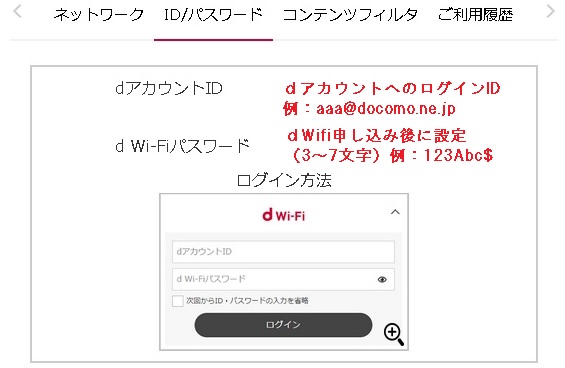 | パスワード | ①docomo Wi-Fiの場合 ・ドコモで設定したパスワード ②d Wi-Fiの場合 ・d Wi-Fiのパスワード ※dアカウントのパスワードでは無い |