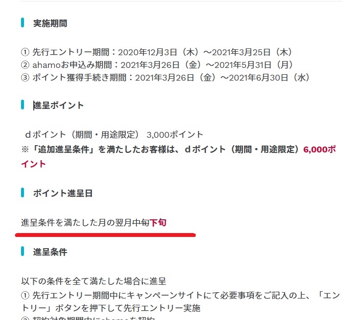 【ahamo】先行エントリーキャンペーンのポイント付与が延期・・ 雑記 2021年05月20日 最終更新日:2021/05/21 ドコモからahamoに乗り換えて約1か月超。 先日、そういえばahamoの先行エントリーキャンペーンであった3000(条件を満たせば6000)のポイントはどうだったかな?と思って確認したら付与されておらず・・・。 ahamoのサイトを見直したら・・・こっそり修正されてました。 〇内容(引用元より一部抜粋) ポイント進呈日 進呈条件を満たした月の翌月中旬下旬 〇画像(引用元より一部抜粋) ※画像の赤下線は当方にて追加 引用元:ahamo先行エントリーキャンペーン こっそり中旬を取消線で消して下旬に変更。 勿論、追記日等の情報はありません・・。 正直、多くの人が知りたい情報なのにフェアーじゃないですよね。。 さて、明日(/521)から下旬に入るのですが、具体的にはいつなのでしょうかね・・? ※※2021/05/21追記 本日(05/21)、先行キャンペーンのポイントの追加がされているのを確認しました。 ちなみに、今回の先行キャンペーンで付与された期間限定ポイントの期限は2021/11/30までです。 忘れずに消化しましょう! 以上 〇改定履歴 ・2021/05/20 初版 ・2021/05/21 先行キャンペーンのポイント追加を確認 タグもどき:ahamo ポイント