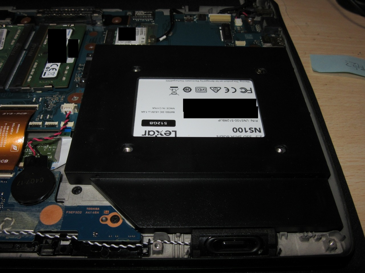 【東芝_R73/B等用】光学ドライブベイ用HDDマウンタ(2.5')の購入 PC(ハード) 2021年07月11日 最終更新日:2021/07/11 先日入手した、東芝Bynabook R73/Bの改造ネタ(その1)です。 まずは、DISKの増設。 現在は、M.2(SATA)SSDが2.5'ベイに入っているのですが、容量が128GBなので一寸使いにくい・・。 更に、接続されている端子が、M.2(SATA)用なので、2.5'SATAタイプのSSDやHDDも接続不可。 と言う訳で先人の方々の知恵を拝借したところ、本器には元々光学ドライブベイ用の端子が有り、それを利用すれば2.5'のDISKがもう1つ使えるとの事。 但し、構成で光学ドライブ付きの物だとガチャポンして終わりなのですが、本体に光学ドライブ用の切り込みが無くてもベゼルを外した状態なら入るらしい・・。 と言う訳で、当方も早速試してみようと思った次第です。 (というかドライブ無しならダミーベゼルなら良かったと思うのですけどねぇ・・) 〇光学ドライブベイにSSDを装着した様子 0.目次 1.目的 2.購入した物 2-1)chipal_ドライブベイ用HDDマウンタ(プラ) 2-1-1)海外からの到着まで日数等 2-1-2)配送詳細 2-1-3)同梱品 2-2)ノーブランド_ドライブベイ用HDDマウンタ(MAC用)(アルミ) 2-2-1)海外からの到着まで日数等 2-2-2)配送詳細 2-2-3)同梱品 3.2つの製品比較 3-1)2つの違い 3-2)装着可能なDISKについて 3-3)光学ドライブベイの転送速度について 3-4)2.5'HDD(7mm)の使用について 3-5)光学ドライブベイからのOS起動について 4.まとめ つづきはこちら PR