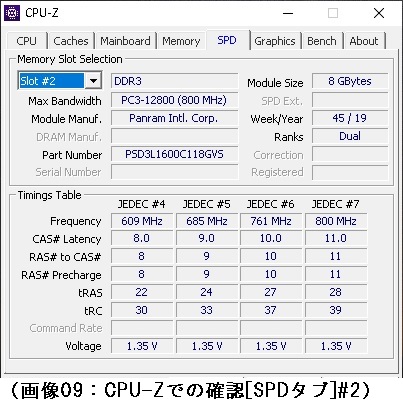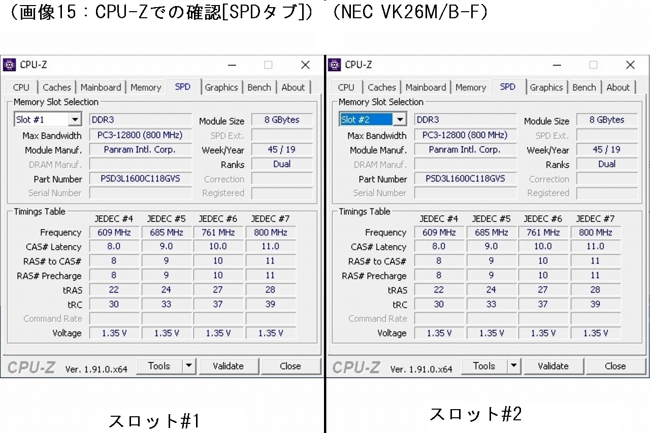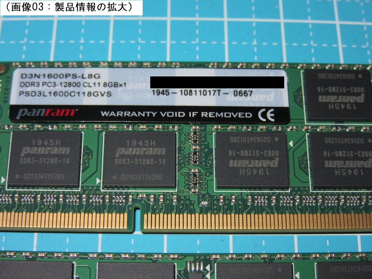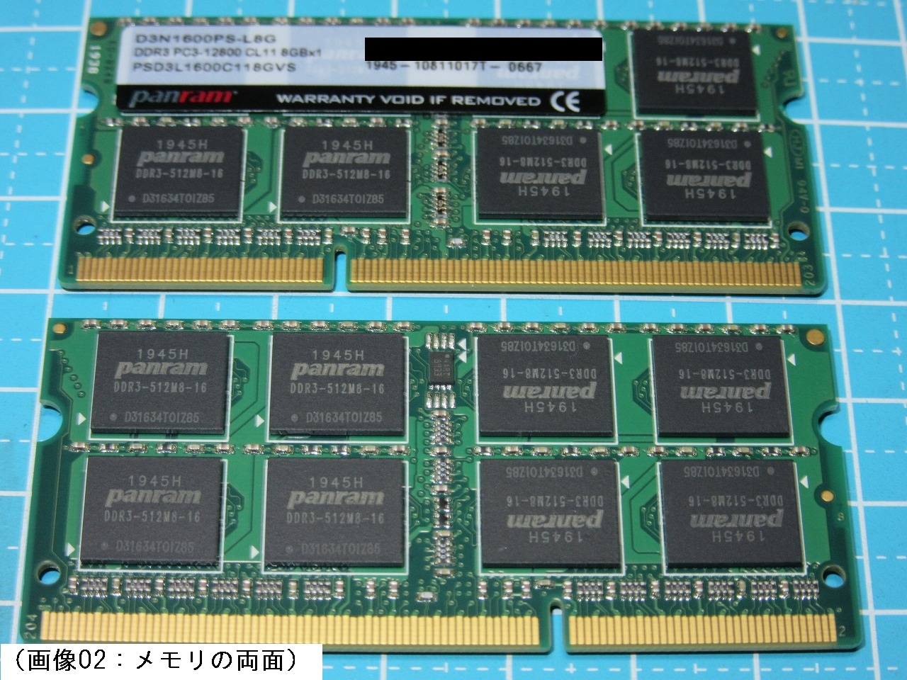one's way > PC(ハード) > 【DDR-3L】CFD(Panram) メモリー(16GB)への換装(D3N1600PS-L8Gx2) 【DDR-3L】CFD(Panram) メモリー(16GB)への換装(D3N1600PS-L8Gx2) PC(ハード) 2019年12月14日 最終更新日:2019/12/14 先日のAmazonサイバーマンデーで安売りしていたCFD(Panram)製DDR-3Lメモリを入手・検証してみた話です。 購入した型番はD3N1600PS-L8G(1枚組)で2セット購入しました。 本製品は2枚組もあるのになぜ単品(1枚組)を2セットにしたのかも含めてのお話です。 ○CFD(Panram) D3N1600PS-L8Gx2枚 0.目次 1.経緯 2.選定 2-1)選定条件 2-2)メーカ選定について 2-3)購入方法について 3.検品 4.検証 4-1)Lenovo X220での動作確認 4-2)NEC VK26M/B-Fでの動作確認 4-3)Panasonic CF-NX4での動作確認 5.評価 6.まとめ 1.経緯 元々、NECのノートPC(VK26M/B-F)用を8GBx2の16GB化したくて様子を見ていたのですが、 ここ最近特に安くなった為です。 そして先日のサイバーマンデーの日は更に値下がりしていたので、思わずポチってしまいました。 2.選定 現在、Lenovo x220に装着しているTrancend製の実績もあるので、今回も同じ型番にしようと思っていたのですが、値段の関係で断念し再選定を行いました。 まず、条件は次の通りです。 2-1)選定条件 ・ノートPC用DDR3型の省電力タイプ(つまり1.35VのL付き) →DDR3L-12800が現在のDDR3系で主流と思います。 ・容量は該当機種の対応CPUの上限である8GBx2枚の合計16GB化 尚、換装対象としては以下の①又は②の2台のどちらかであるが、他にもやりたい事はあるので今回は1台分のみ増設し、残り1台は8GB(4GBx2)のままとする。 (SSDへの換装とかもしたいのですがね・・) ○現在所有しているPCと現状 ・今回の増強予定対象 ①NEC Versarpro VK26M/B-F(#1)[PC-VK26MBZCF](Corei5-3320M/Ivy Bridge) →現状:PC3L-12800/4GBx2枚の8MB ②NEC Versarpro VK26M/B-F(#2)[PC-VK26MBZCF](Corei5-3320M/Ivy Bridge) →現状:PC3L-12800/4GB+2GBの6MB ③Panasonic CF-NX4[CF-NX4EDHCS](Corei5-5300U/Broadwell) →現状:PC3L-12800/4GBx1枚の4GB ※このCF-NX4ですが、実はメモリーをポチった後に見つけて買ってしまいました・・ 尚、ジャンクなので、いつもの通り弄る予定です(記事は後日の予定) ・増強済み ③Lenovo x220[4290-KF4](Corei7-2640M/Sandy Bridge) ※PC3L-12800/8GBx2枚の16GB化済(CPUの上限) ④Panasonic CF-SX1[CF-SX1HECDP](Corei7-2640M/Sandy Bridge) ※PC3L-10600/8GBx2枚の16GB化済(CPUの上限) ⑤Lenovo x200[7457-4PJ](Core2 Duo P8400) ※PC3L-12800/4GBx2枚の8GB化済(CPUの上限)※本製品では対象外 と言う事でメモリをポチった際にはVK26M/B-Fで使用する予定ですが、急遽CF-NX4で使う可能性が高いです。 2-2)メーカ選定について 当方の過去の使用実績や現在の人気及び価格・信頼度を比較し、次の候補から選択する事とした。 a)メーカ候補 ①シリコンパワー(SP008GLSTU160N02) ②CFD(Panram) (D3N1600PS-L8G) ③キングストン(KVR16LS11K2) ④Crucial-Micron(CT2KIT102464BF160B) b)使用実績(公私両方) ・①/②/③ ※家ではTrancend、仕事ではシリコンパワーやキングストンのメモリ等も良く見ています。 実施はそれ以外にもあるのですが信頼性の観点から除外しています。 c)信頼度 ・③・④<①<② d)保証 ・永久保証である →全て対象 e)価格 購入当日の値段を比較 先の通りサイバーマンデーであったのでその価格で決定しました。 上記を比較検討の結果、ノートPC用でありオーバークロック等の過酷な使用方法では無い点から値段の安かった本製品としました。 但し、デスクトップでオーバークロックを行うのであれば信頼度のある方を選択した可能性はあります。 2-3)購入方法について 単純に8GBx2枚の1組でも良かったが、翌々調べると8GBx1枚を2組購入した方が合計金額が安かった為、後者を選択。 尚、2枚1組と1枚2組の違いについては細かい点(相性問題の可能性等)は多少あるが、問題ないと判断しました。 この辺りは、その時によって値段が変わる可能性があるので、各自で確認された方が良いと思います。 それらの結果、今回の製品であるCFD(Panram)社製D3N1600PS-L8Gx2組となった次第です。 3.検品 先の通り、当方は省電力型の8GBx1枚を2組購入した為、パッケージは2個あります。 ○パッケージ ○メモリの両面 尚、内容物はメモリのみで、型番はD3N1600PS-L8Gで低電圧(1.35V)の物と間違いありませんでした。 ○製品情報の拡大 尚、Amazonの商品ページの画像と異なりますが、チップは片面8個の両面16個のタイプです。 (商品ページの画像1・2は片面4個(両面8個)タイプ) 4.検証 不良品で無いかを確認する為、PCに装着してみました。 尚、本来なら当初の予定通りNECのPC(①又は②)に装着するのが一番なのですが、本体を分解しないといけない為、まずはメモリの着脱が簡単なx220で確認を実施 問題なければ、後日時間のある時にNECのPCに換装する事とした。 4-1)Lenovo X220での動作確認 ○使用ハード ・Lenovo x220[4290-KF4](Corei7-2640M/Sandy Bridge) ○条件 以下の状況で確認 ・OS:Windows10 Pro 64Bit ・CPU-Z:V 1.90.0.x64 ・作業前のメモリ容量:8GBx2(Trancend製) ※動作確認の為、一時的に交換 ○結果 特に問題無く、BIOS/OS上及びCPU-Zからも16GBを認識しました。 ○メモリ装着の様子 ※背面から2スロット交換可能なのはやはり便利ですよ
